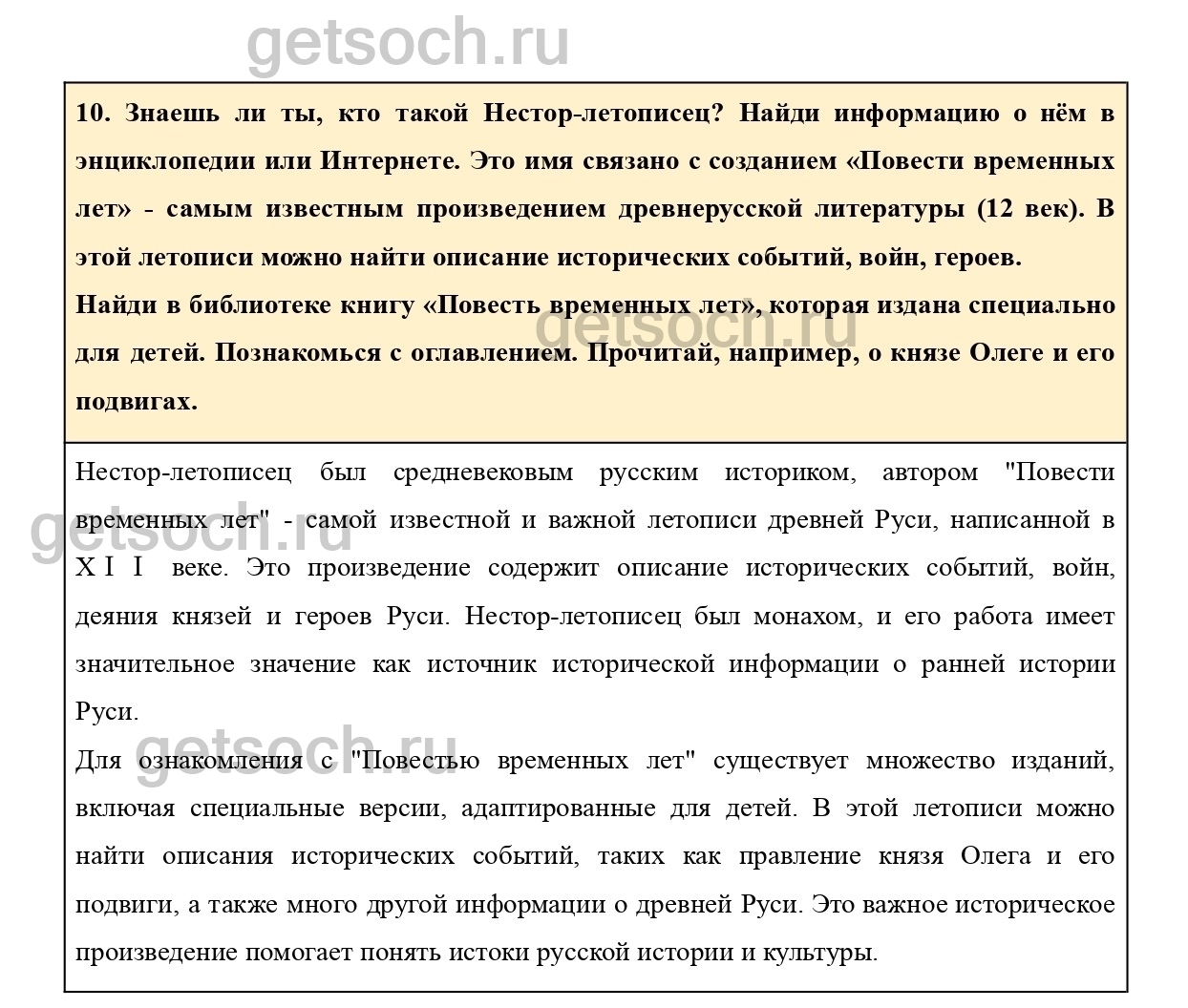 Знаешь ли ты, кто такой Нестор-летописец? Найди информацию о нём в энциклопедии или Интернете. Это имя связано с созданием «Повести временных лет» – самым известным произведением древнерусской литературы (12 век). В этой летописи можно найти описание исторических событий, войн, героев.
