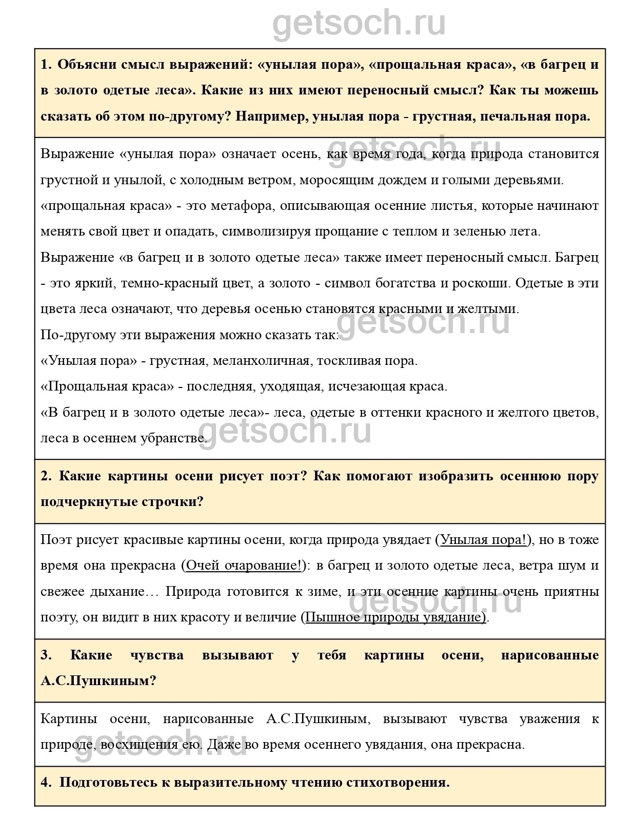 Объясни смысл выражений: «унылая пора», «прощальная краса», «в багрец и в золото одетые леса». Какие из них имеют переносный смысл? Как ты можешь сказать об этом по-другому? Например, унылая пора – грустная, печальная пора.