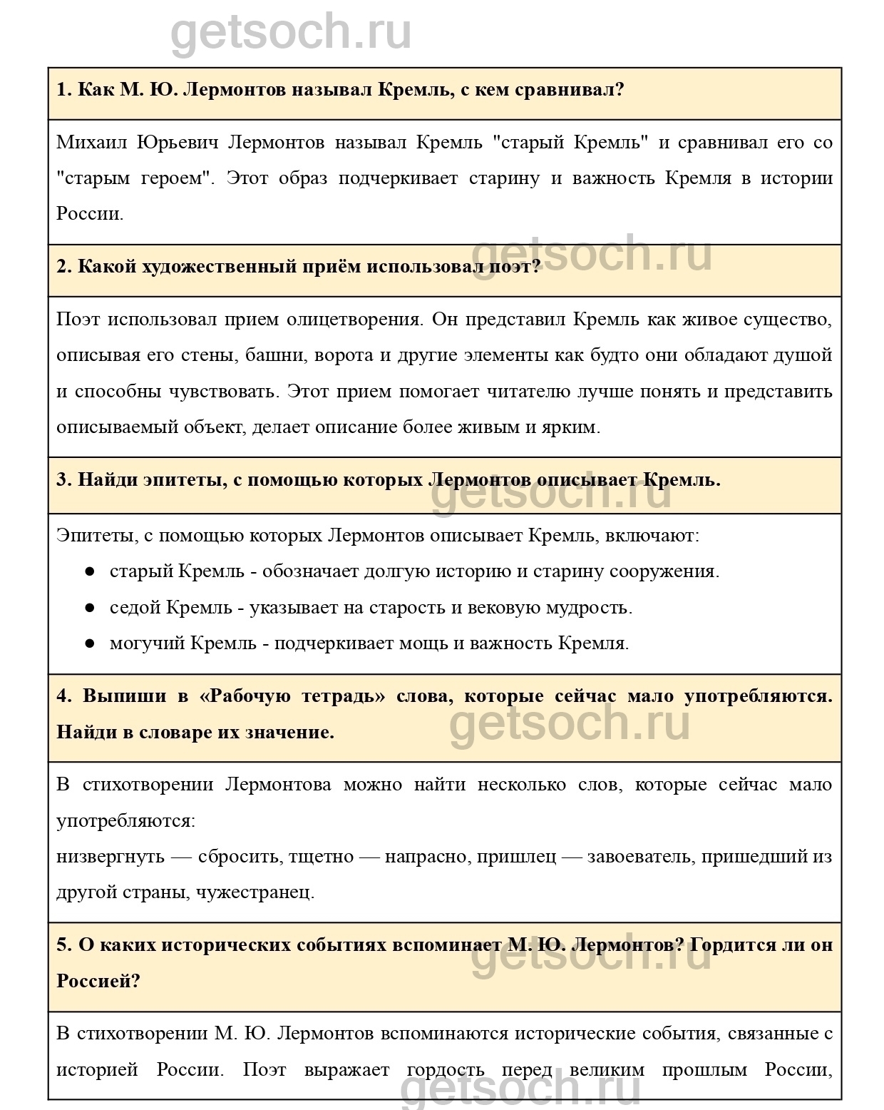 Найди эпитеты, с помощью которых Лермонтов описывает Кремль.
