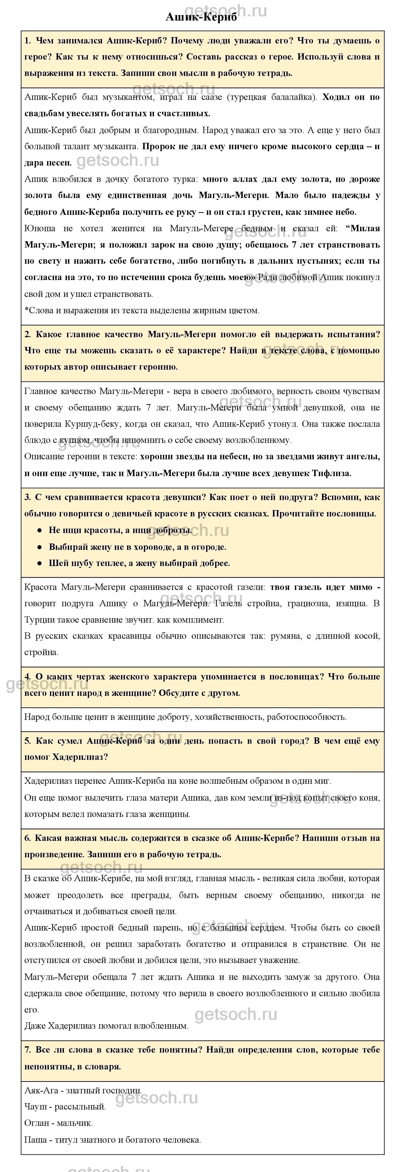 Чем занимался Ашик-Кериб? Почему люди уважали его? Что ты думаешь о герое? Как ты к нему относишься? Составь рассказ о герое. Используй слова и выражения из текста. Запиши свои мысли в рабочую тетрадь.