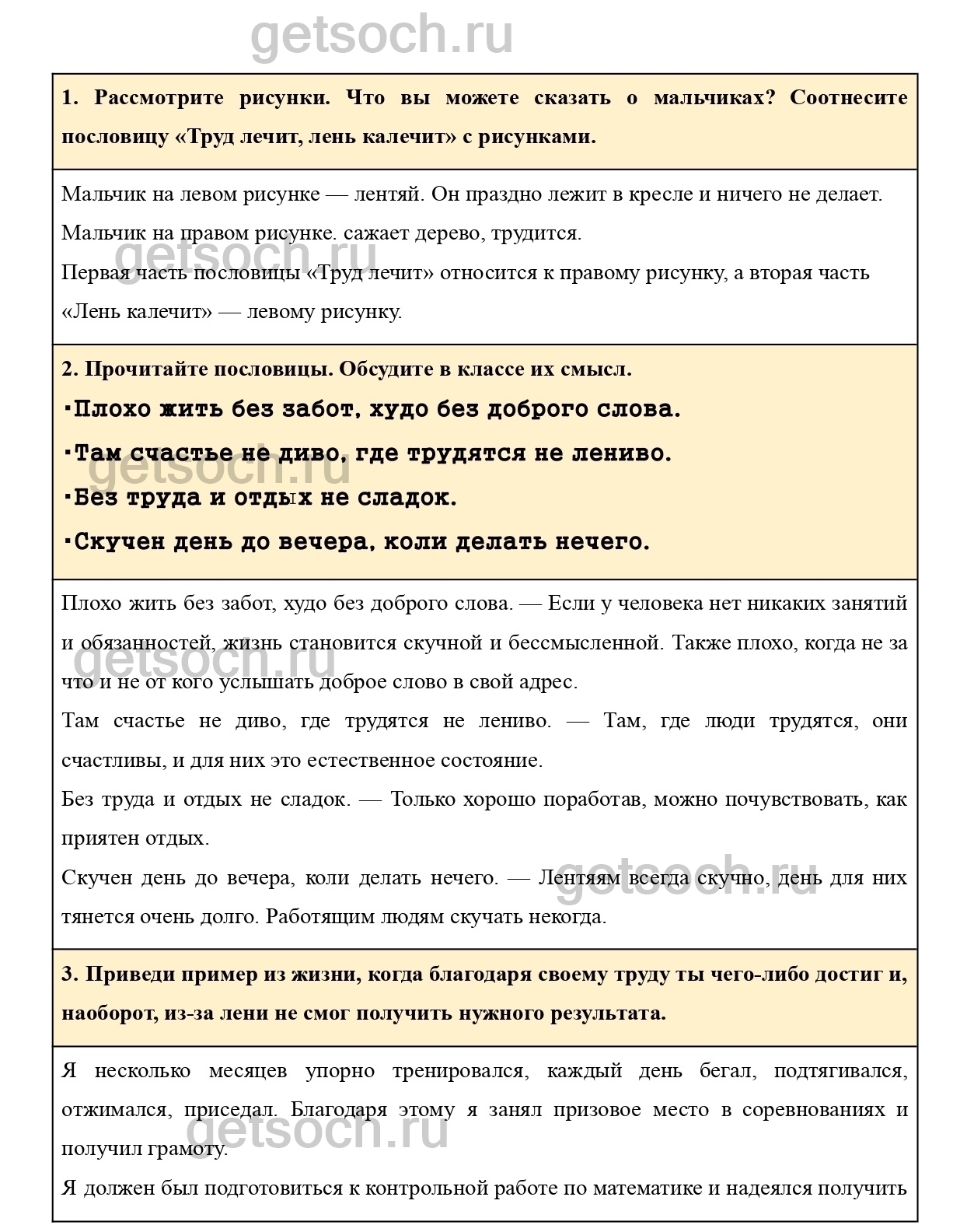 Рассмотрите рисунки. Что вы можете сказать о мальчиках? Соотнесите пословицу «Труд лечит, лень калечит» с рисунками.