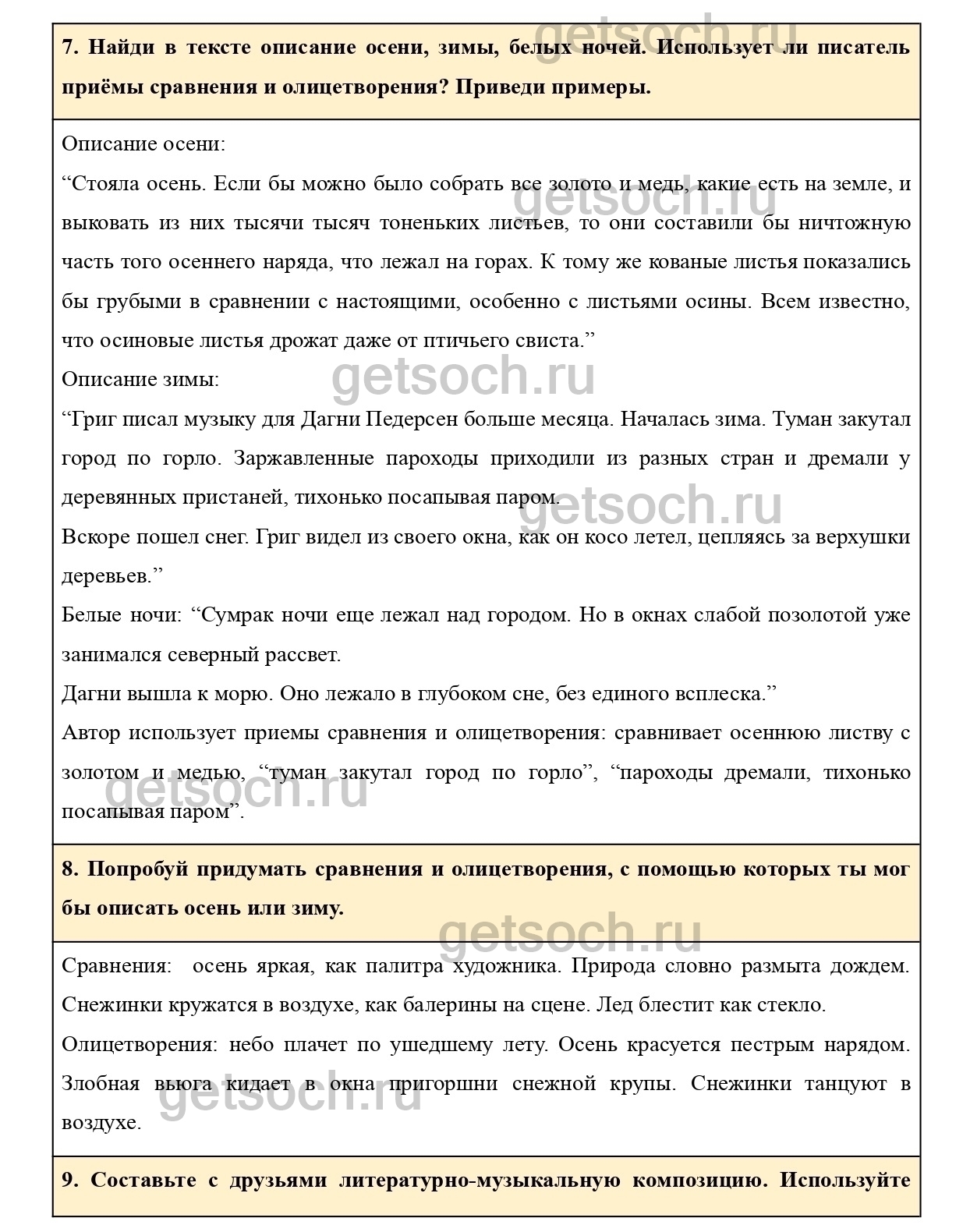 Найди в тексте описание осени, зимы, белых ночей. Использует ли писатель приёмы сравнения и олицетворения? Приведи примеры.