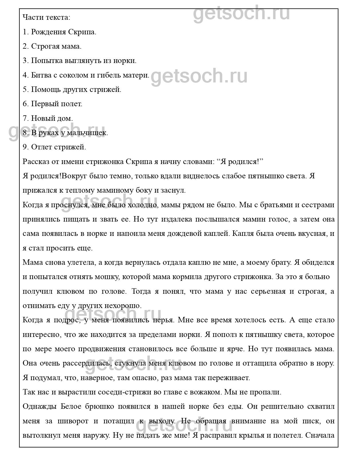 Раздели текст на части, озаглавь каждую из них. С помощью плана перескажи произведение от имени стрижонка Скрипа. С каких слов ты начнёшь свой рассказ? Почему?