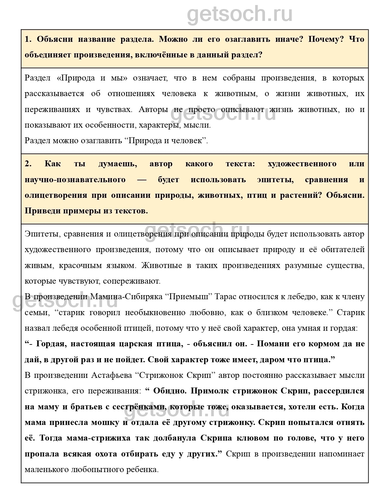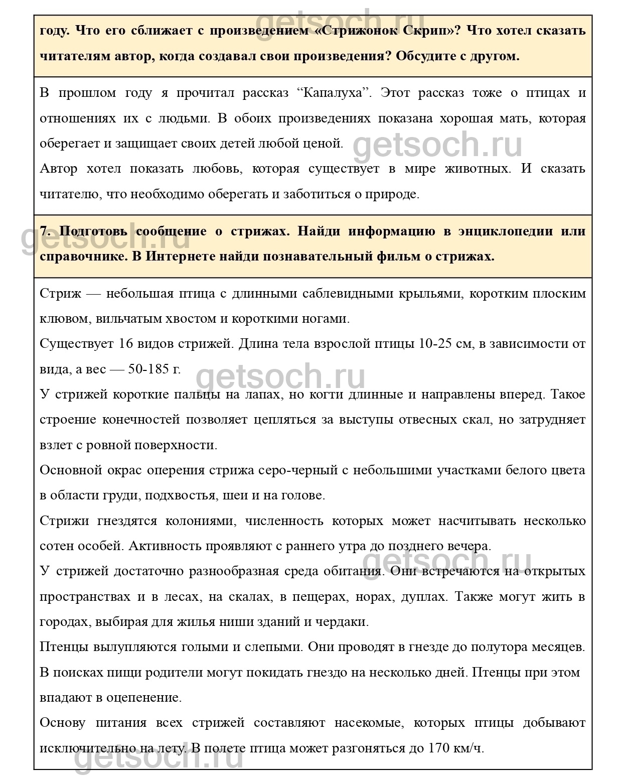 Вспомни рассказ В. Астафьева «Калапуха», который ты прочитал в прошлом году. Что его сближает с произведением «Стрижонок Скрип»? Что хотел сказать читателям автор, когда создавал свои произведения? Обсудите с другом.