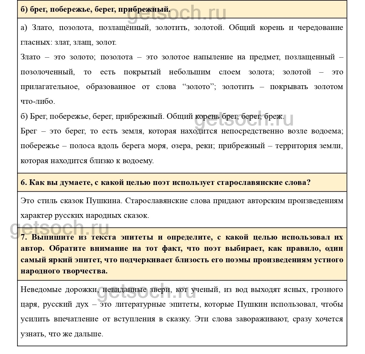 5. А.С. Пушкин использует в поэме старославянские по происхождению слова, например: златая, брег, чреда, злато, которые соответствуют русским словам: золотая, берег, череда, золото. Объясните значение родственных слов. Найдите в них общий корень. Укажите чередование гласных и согласных звуков: