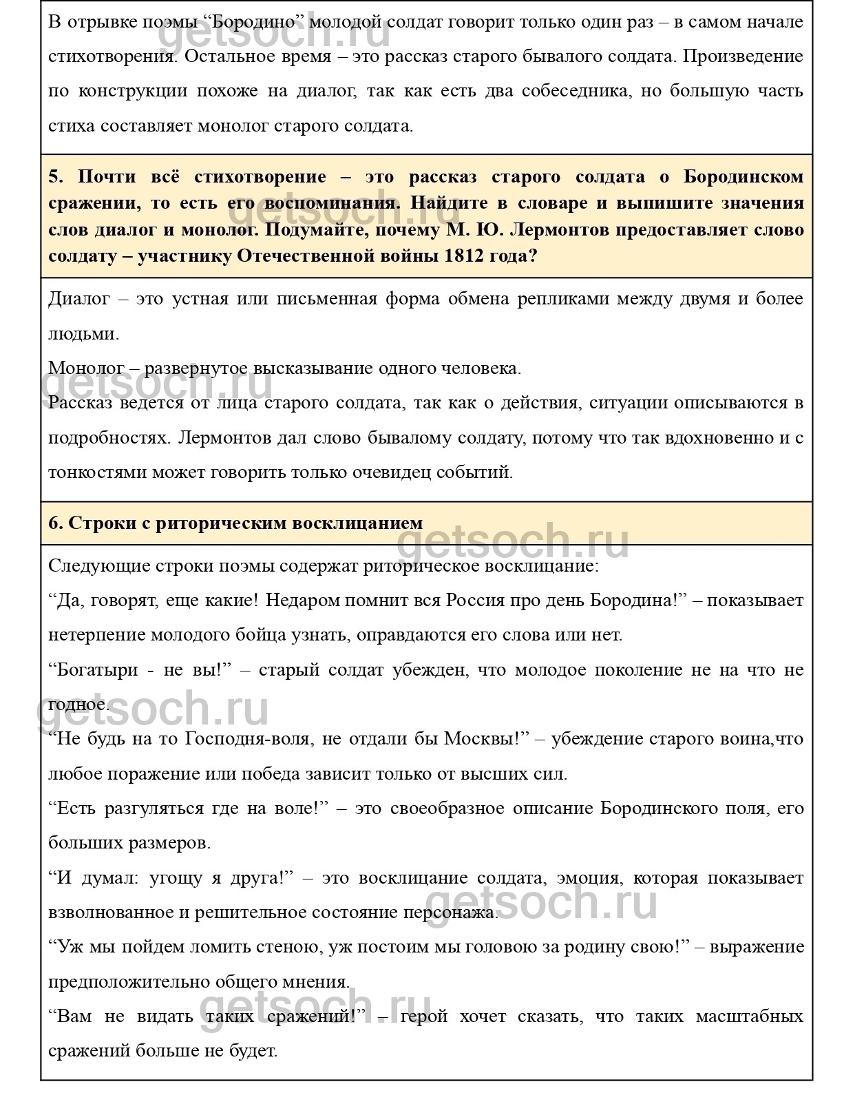 5. Почти всё стихотворение – это рассказ старого солдата о Бородинском сражении, то есть его воспоминания. Найдите в словаре и выпишите значения слов диалог и монолог. Подумайте, почему М. Ю. Лермонтов предоставляет слово солдату – участнику Отечественной войны 1812 года?