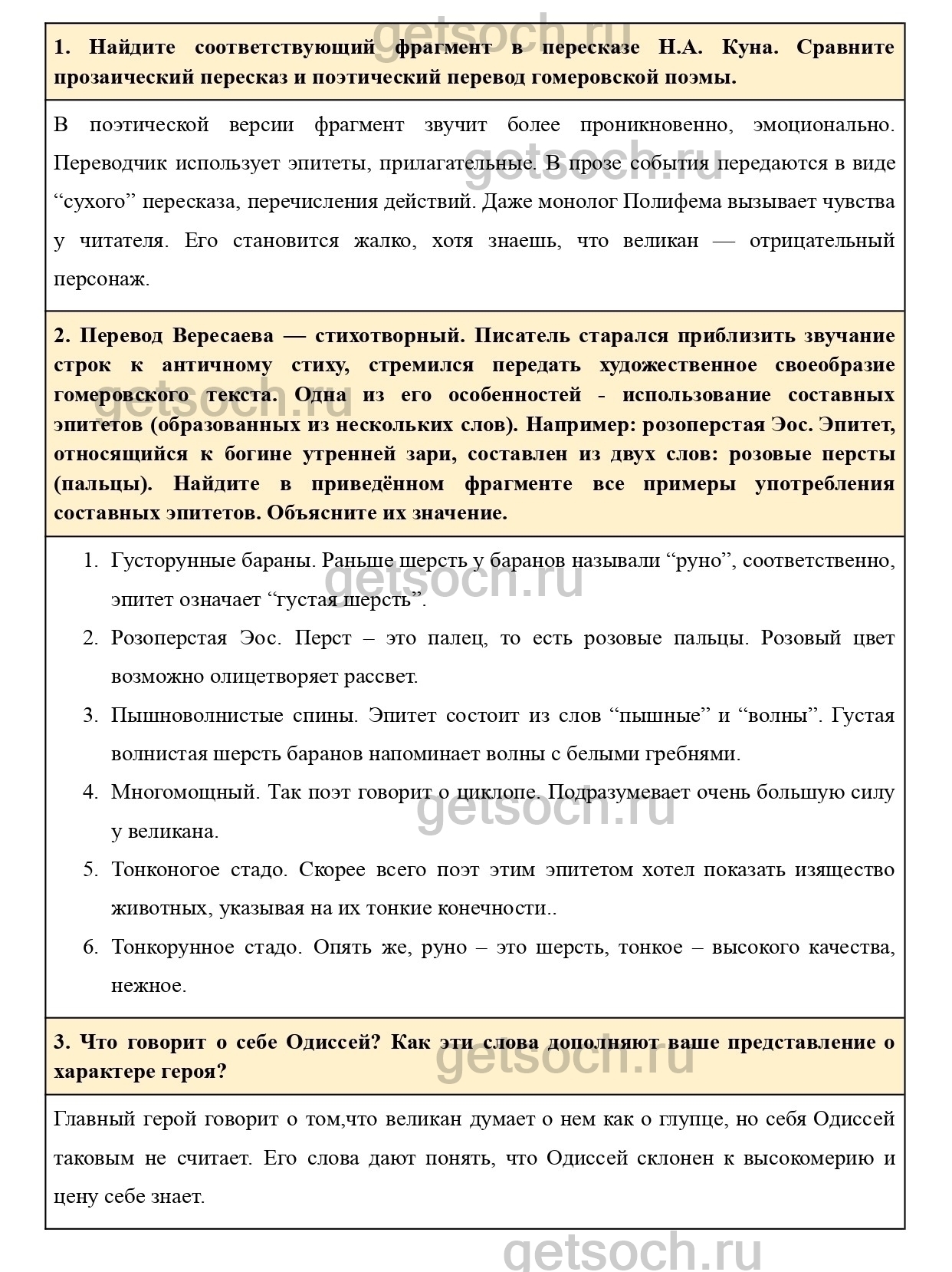1. Найдите соответствующий фрагмент в пересказе H.A. Куна. Сравните прозаический пересказ и поэтический перевод гомеровской поэмы.