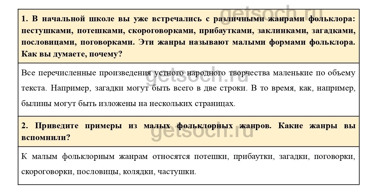 1. В начальной школе вы уже встречались с различными жанрами фольклора: пестушками, потешками, скороговорками, прибаутками, заклинками, загадками, пословицами, поговорками. Эти жанры называют малыми формами фольклора. Как вы думаете, почему?