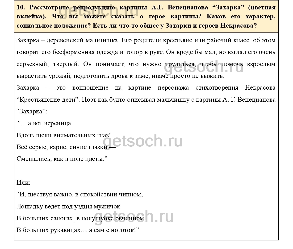 10. Рассмотрите репродукцию картины А.Г. Венецианова “Захарка” (цветная вклейка). Что вы можете сказать о герое картины? Каков его характер, социальное положение? Есть ли что-то общее у Захарки и героев Некрасова?