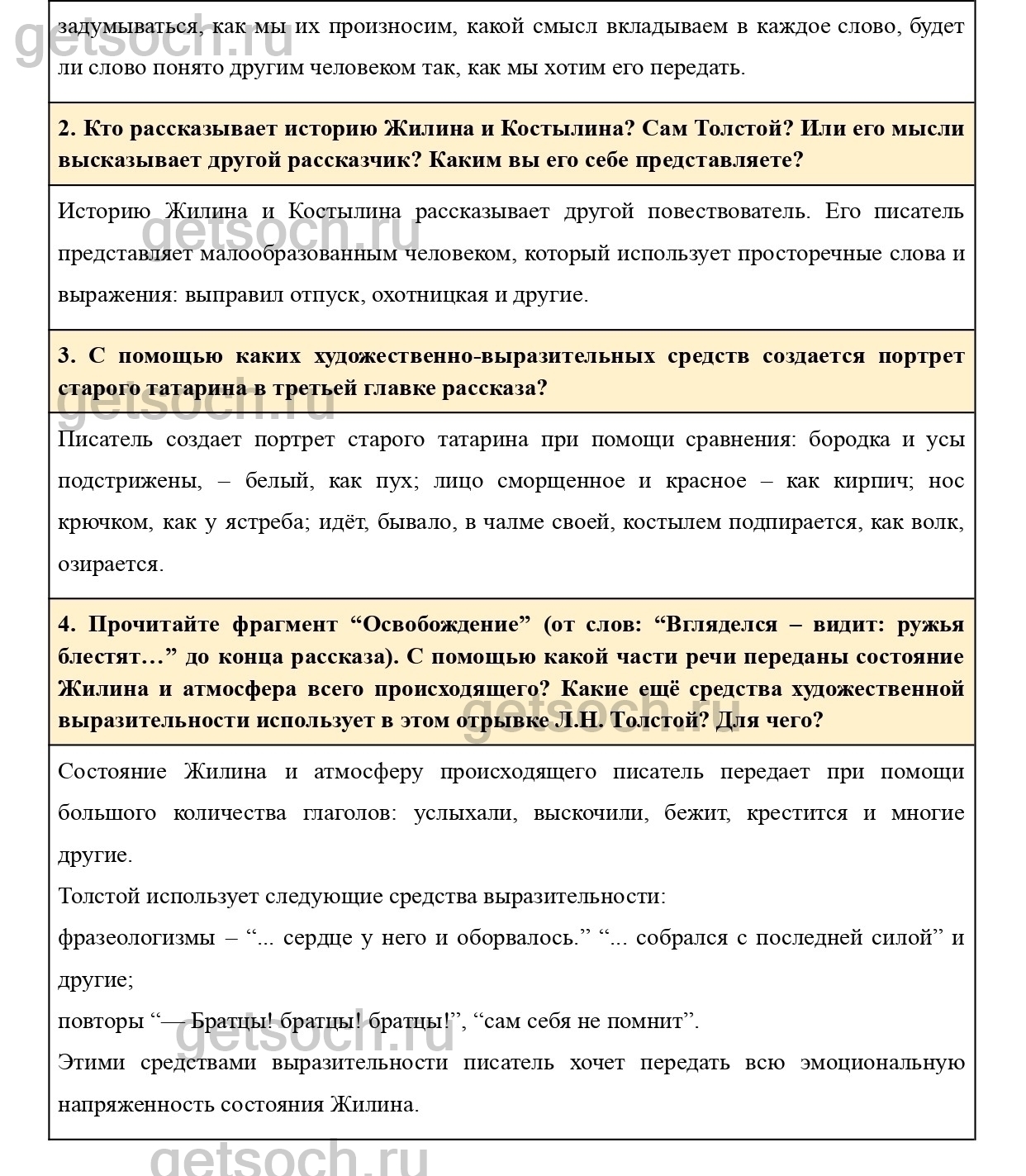 4. Прочитайте фрагмент “Освобождение” (от слов: “Вгляделся – видит: ружья блестят…” до конца рассказа). С помощью какой части речи переданы состояние Жилина и атмосфера всего происходящего? Какие ещё средства художественной выразительности использует в этом отрывке Л.Н. Толстой? Для чего?