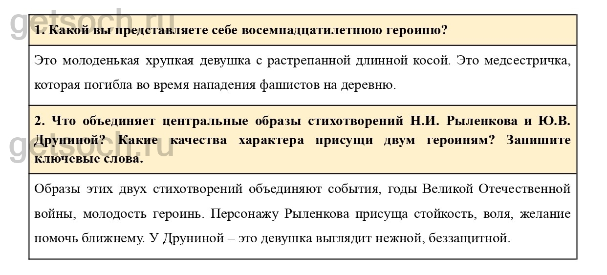 2. Что объединяет центральные образы стихотворений Н.И. Рыленкова и Ю.В. Друниной? Какие качества характера присущи двум героиням? Запишите ключевые слова.