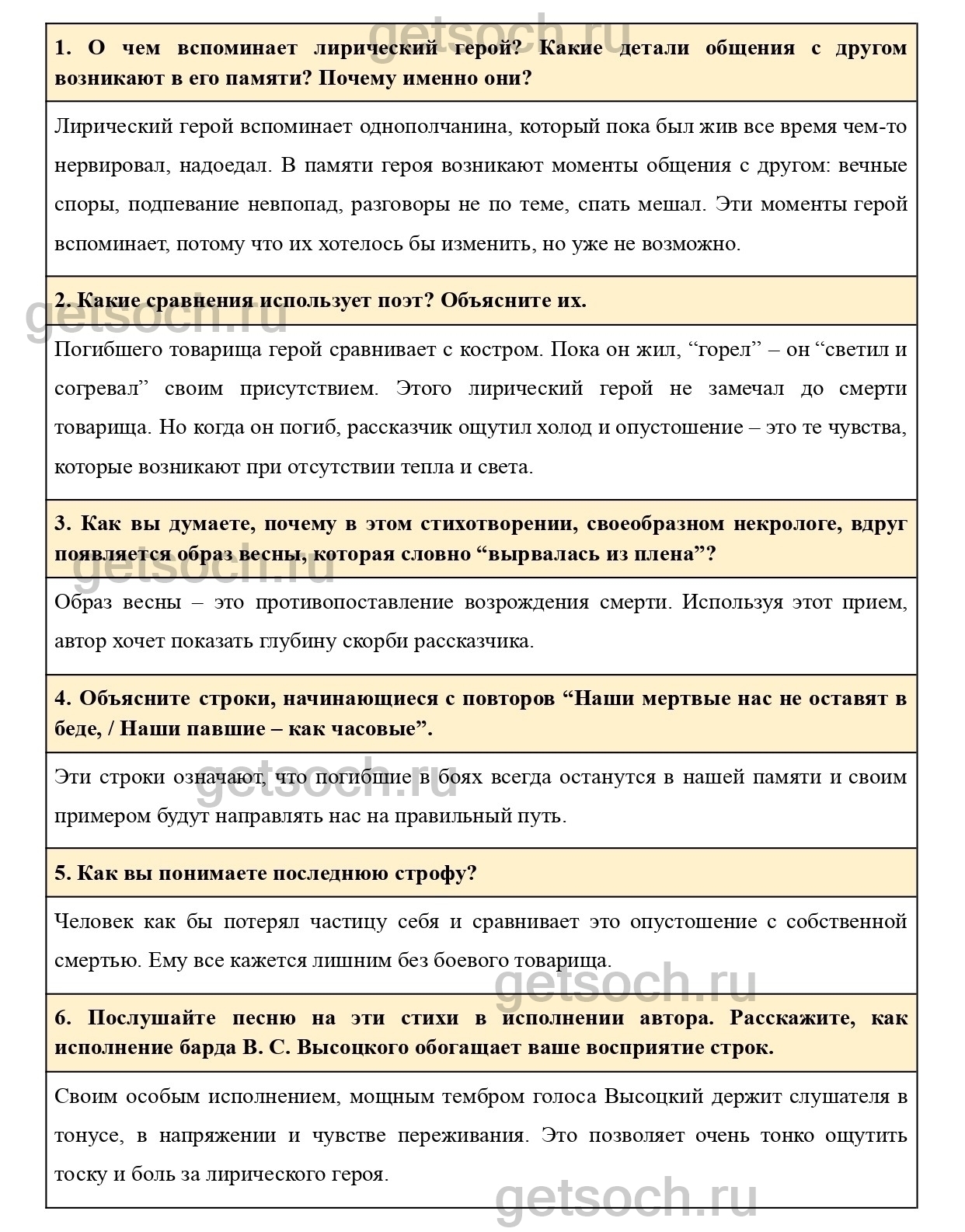 6. Послушайте песню на эти стихи в исполнении автора. Расскажите, как исполнение барда В. С. Высоцкого обогащает ваше восприятие строк.