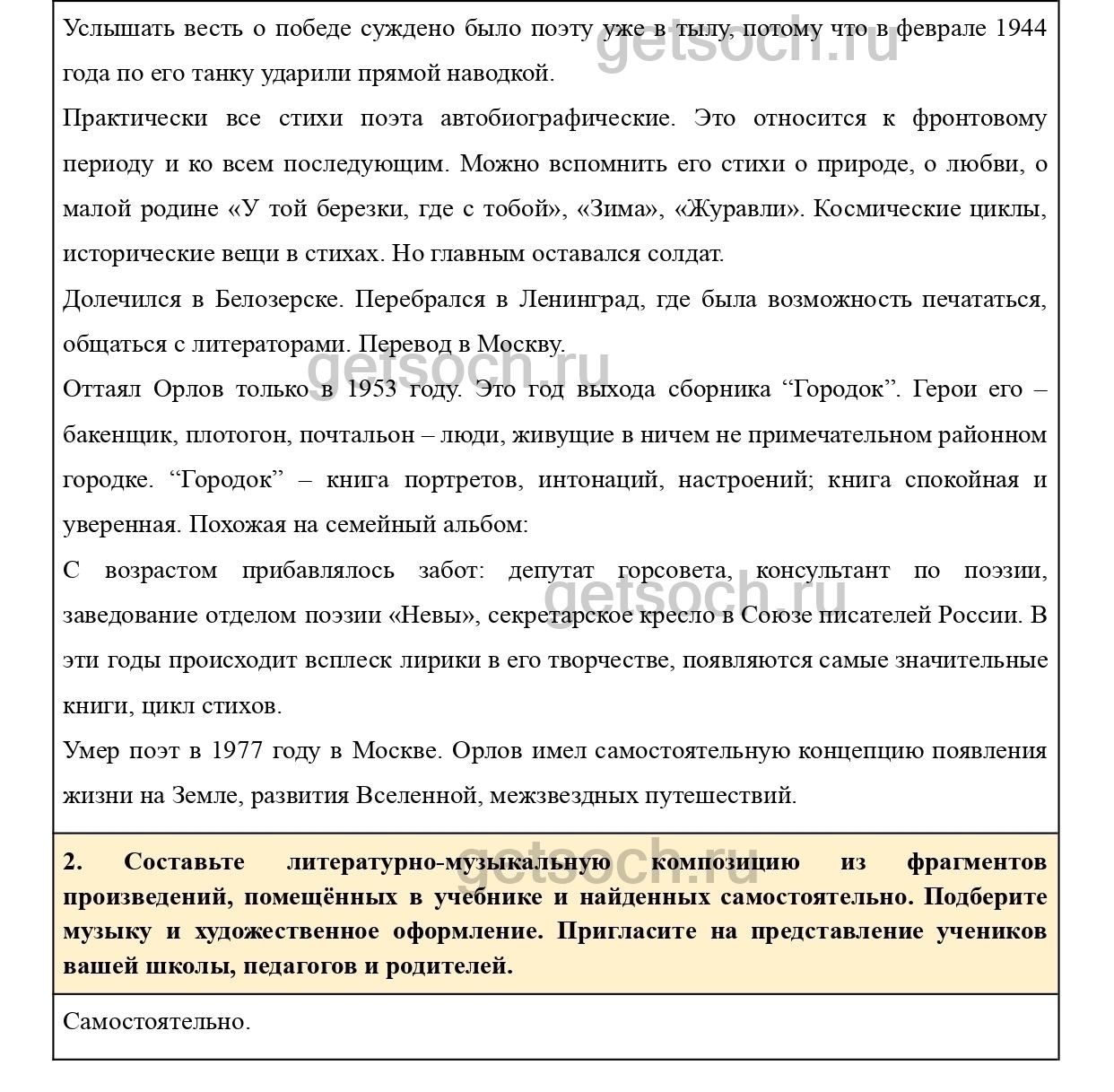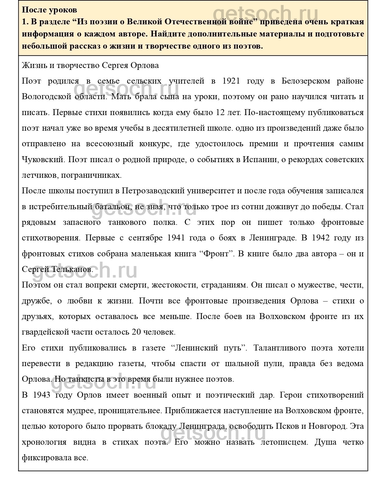 1. В разделе “Из поэзии о Великой Отечественной войне” приведена очень краткая информация о каждом авторе. Найдите дополнительные материалы и подготовьте небольшой рассказ о жизни и творчестве одного из поэтов.