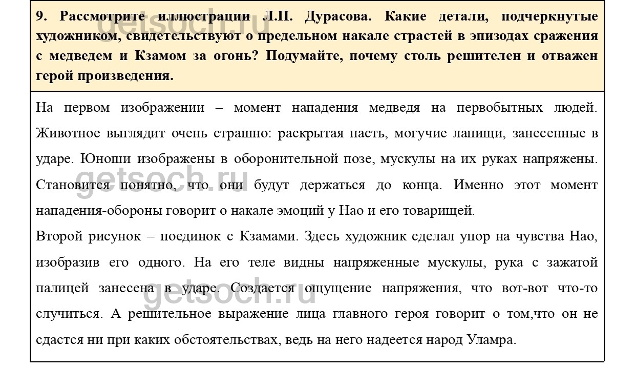 9. Рассмотрите иллюстрации Л.П. Дурасова. Какие детали, подчеркнутые художником, свидетельствуют о предельном накале страстей в эпизодах сражения с медведем и Кзамом за огонь?