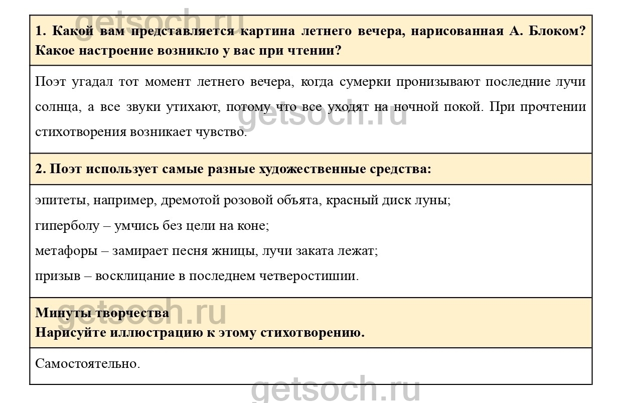 1. Какой вам представляется картина летнего вечера, нарисованная А. Блоком? Какое настроение возникло у вас при чтении?