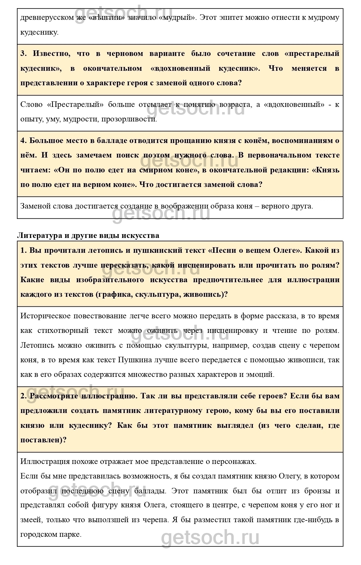 Вы прочитали летопись и пушкинский текст «Песни о вещем Олеге». Какой из этих текстов лучше пересказать, какой инсценировать или прочитать по ролям? Какие виды изобразительного искусства предпочтительнее для иллюстрации каждого из текстов (графика, скульптура, живопись)?