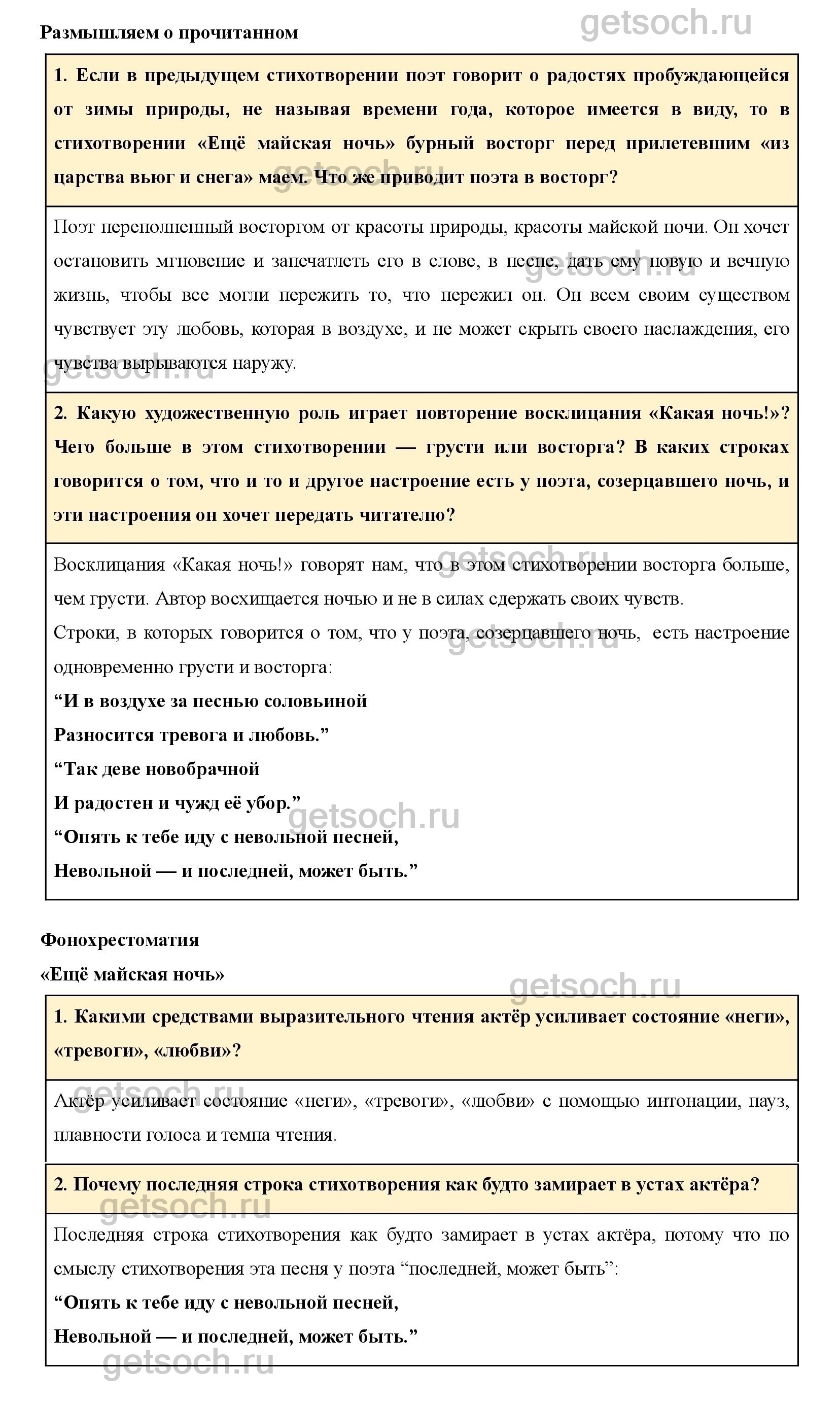 Если в предыдущем стихотворении поэт говорит о радостях пробуждающейся от зимы природы, не называя времени года, которое имеется в виду, то в стихотворении «Ещё майская ночь» бурный восторг перед прилетевшим «из царства вьюг и снега» маем. Что же приводит поэта в восторг?
