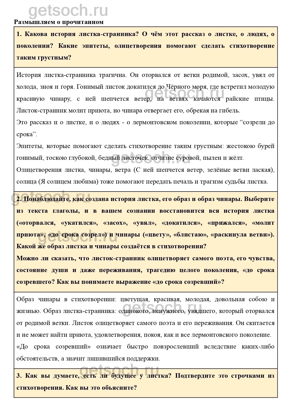 Можно ли сказать, что листок-странник олицетворяет самого поэта, его чувства, состояние души и даже переживания, трагедию целого поколения, «до срока созревшего? Как вы понимаете выражение «до срока созревший»?Как вы думаете, есть ли будущее у листка? Подтвердите это строчками из стихотворения. Как вы это объясните?