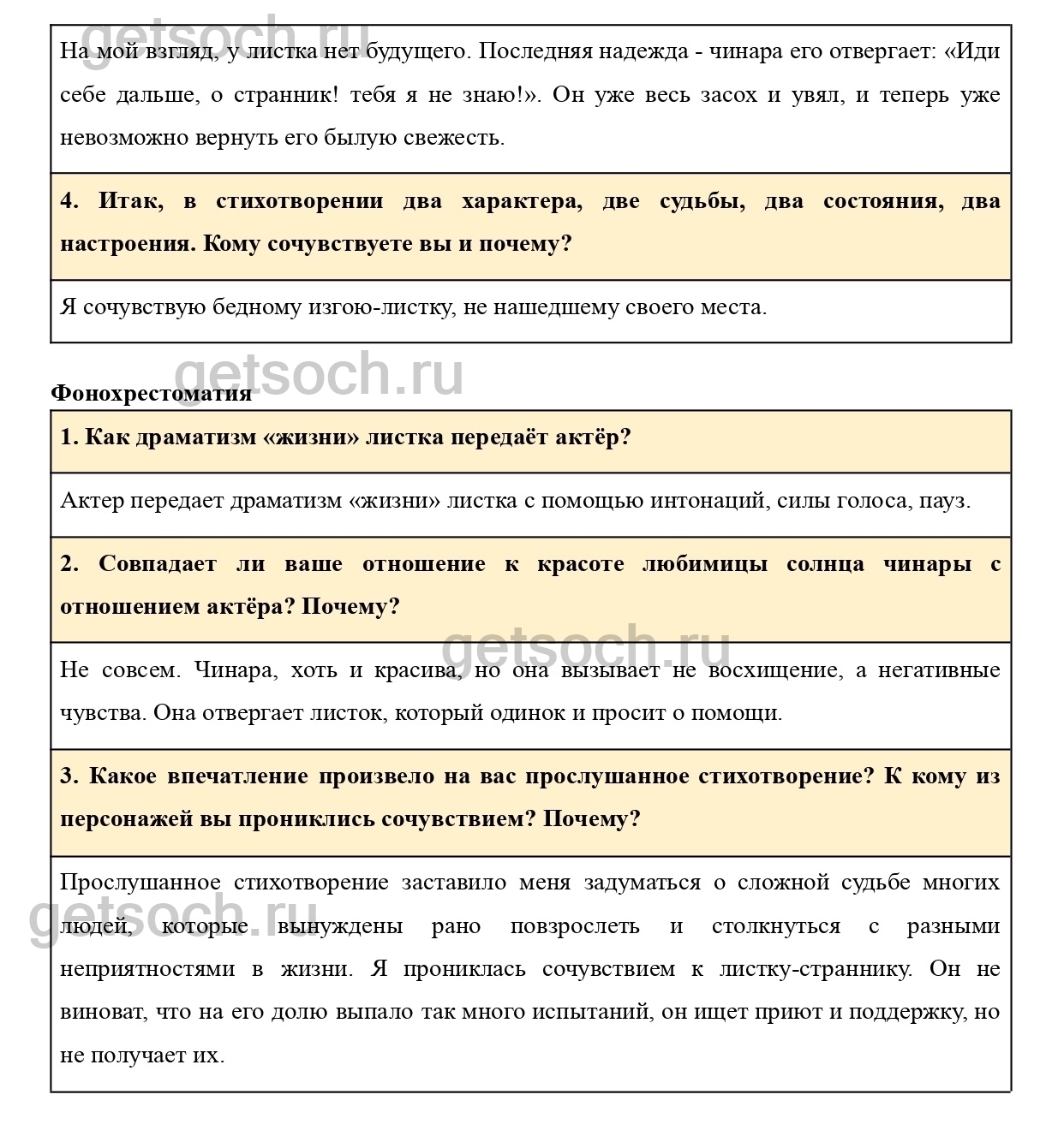 Понаблюдайте, как создана история листка, его образ и образ чинары. Выберите из текста глаголы, и в вашем сознании восстановится вся история листка («оторвался, «укатился», «засох», «увял», «докатился», «прижался», «молит приюта», «до срока созрел») и чинары («цвету», «блистаю», «раскинула ветви»). Какой же образ листка и чинары создаётся в стихотворении?