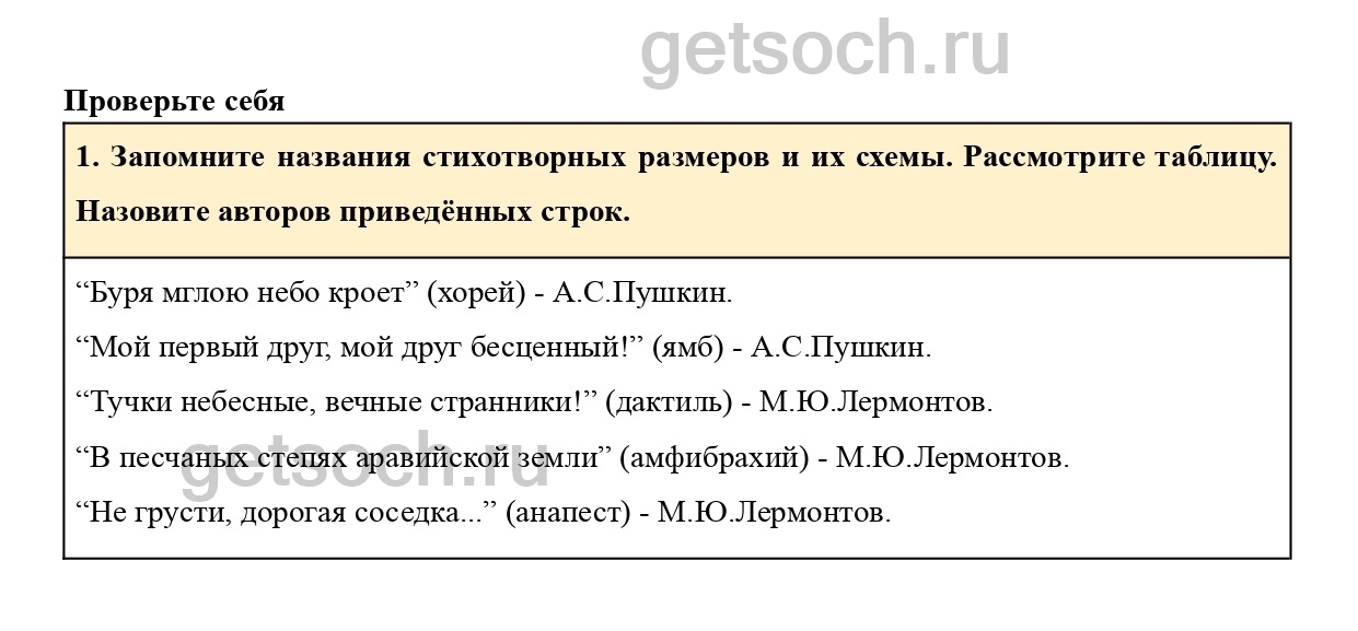 Запомните названия стихотворных размеров и их схемы. Рассмотрите таблицу. Назовите авторов приведённых строк.