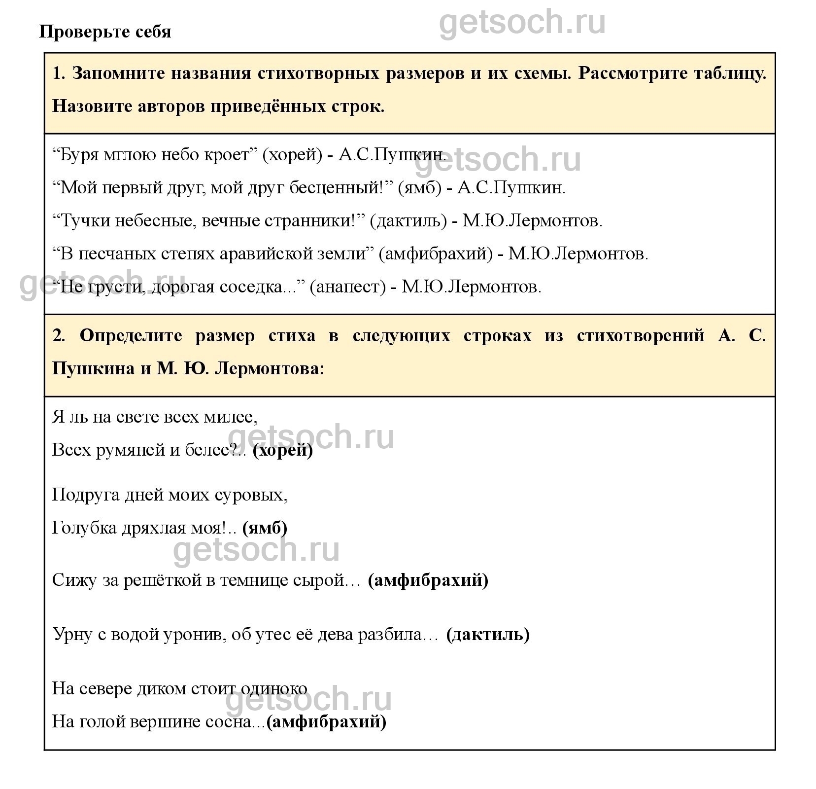 Запомните названия стихотворных размеров и их схемы. Рассмотрите таблицу. Назовите авторов приведённых строк.