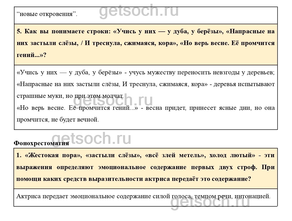 Как вы понимаете строки: «Учись у них — у дуба, у берёзы», «Напрасные на них застыли слёзы, / И треснула, сжимаяся, кора», «Но верь весне. Её промчится гений…»?