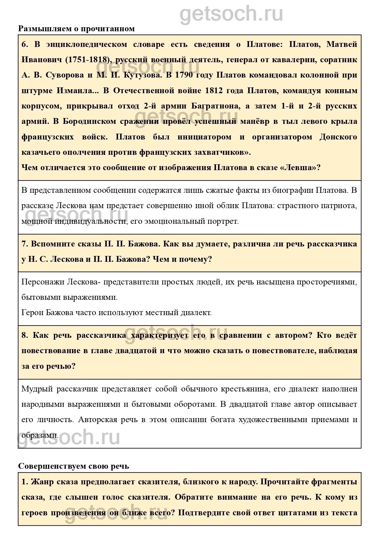 Чем отличается это сообщение от изображения Платова в сказе «Левша»?Вспомните сказы П. П. Бажова. Как вы думаете, различна ли речь рассказчика у Н. С. Лескова и П. П. Бажова? Чем и почему?