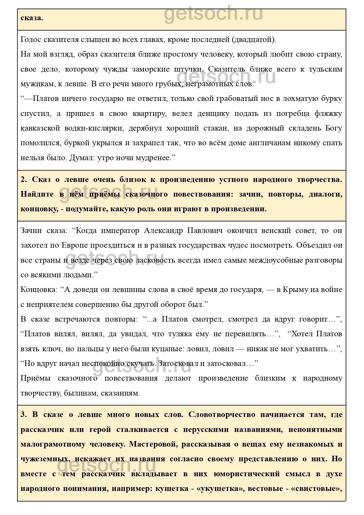 Сказ о левше очень близок к произведению устного народного творчества. Найдите в нём приёмы сказочного повествования: зачин, повторы, диалоги, концовку, – подумайте, какую роль они играют в произведении.
