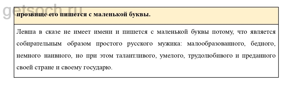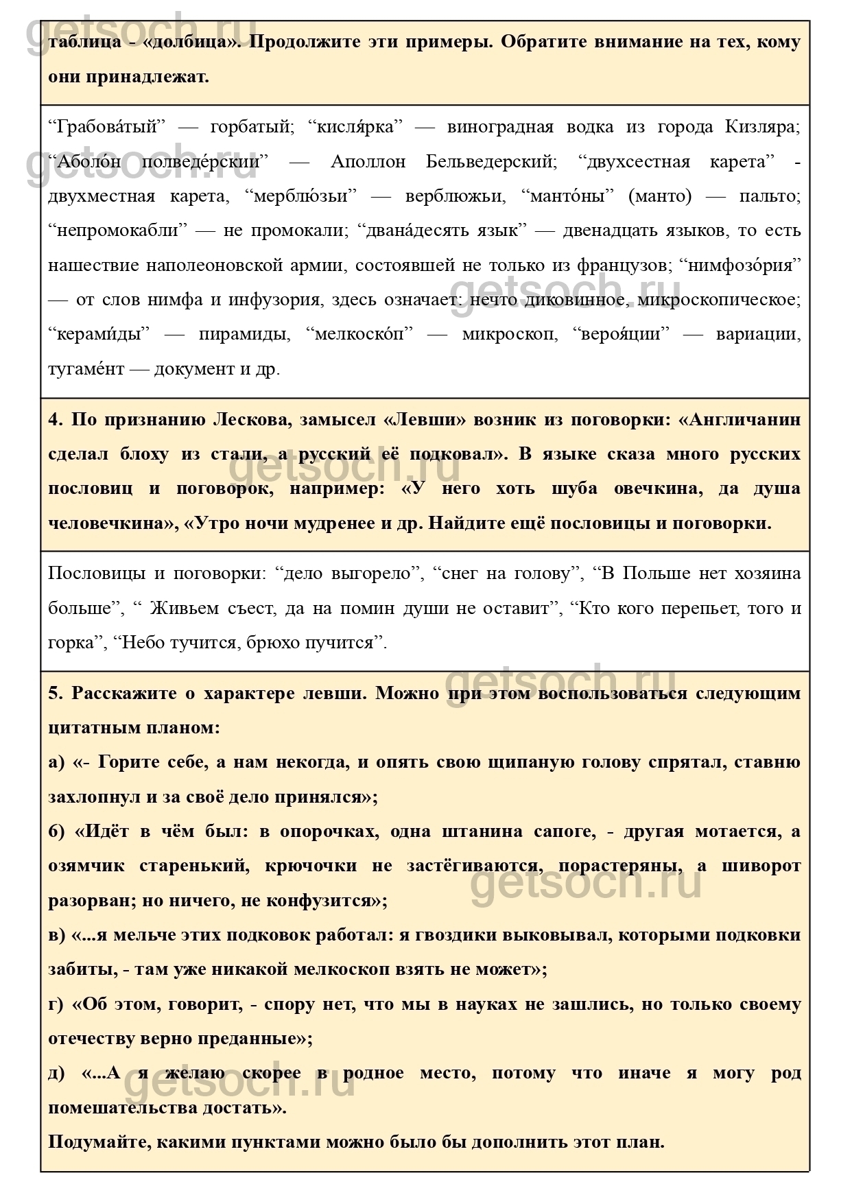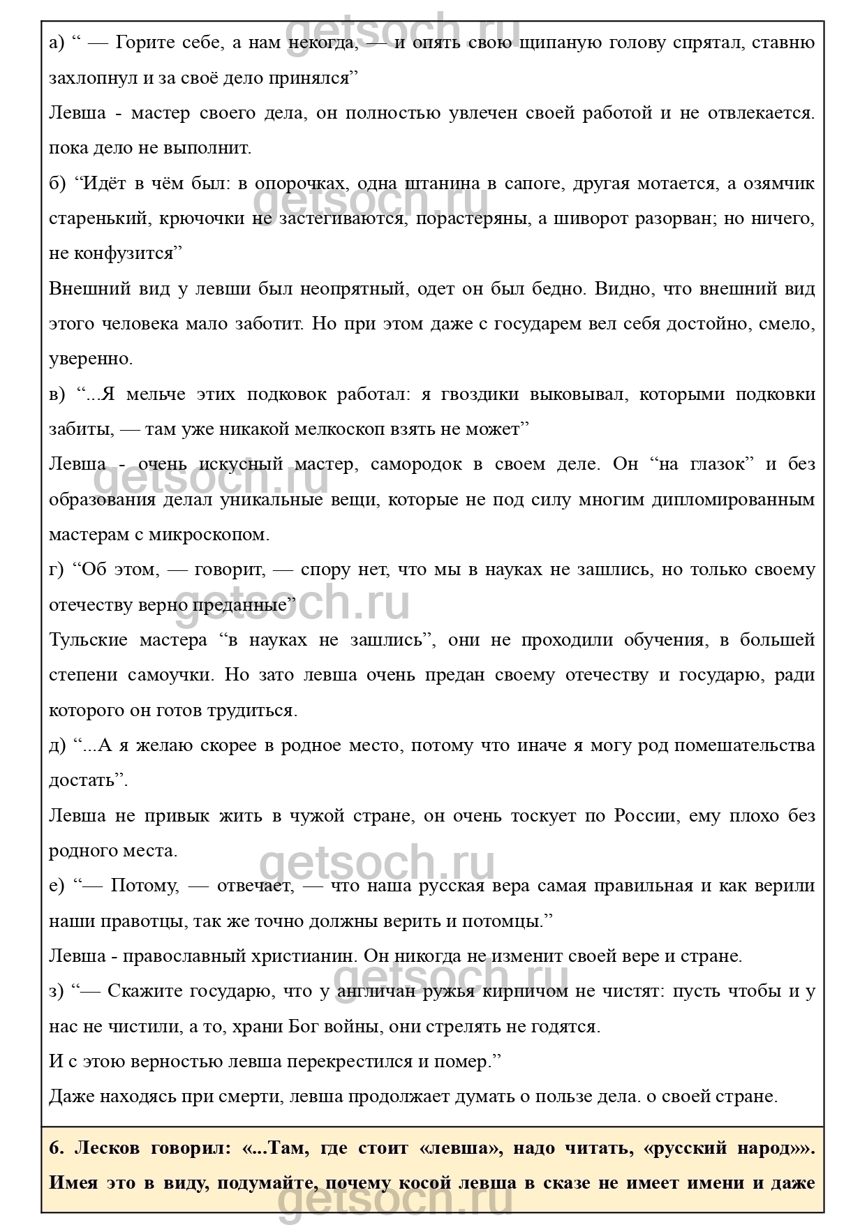 Подумайте, какими пунктами можно было бы дополнить этот план.Лесков говорил: «…Там, где стоит «левша», надо читать, «русский народ»». Имея это в виду, подумайте, почему косой левша в сказе не имеет имени и даже прозвище его пишется с маленькой буквы.