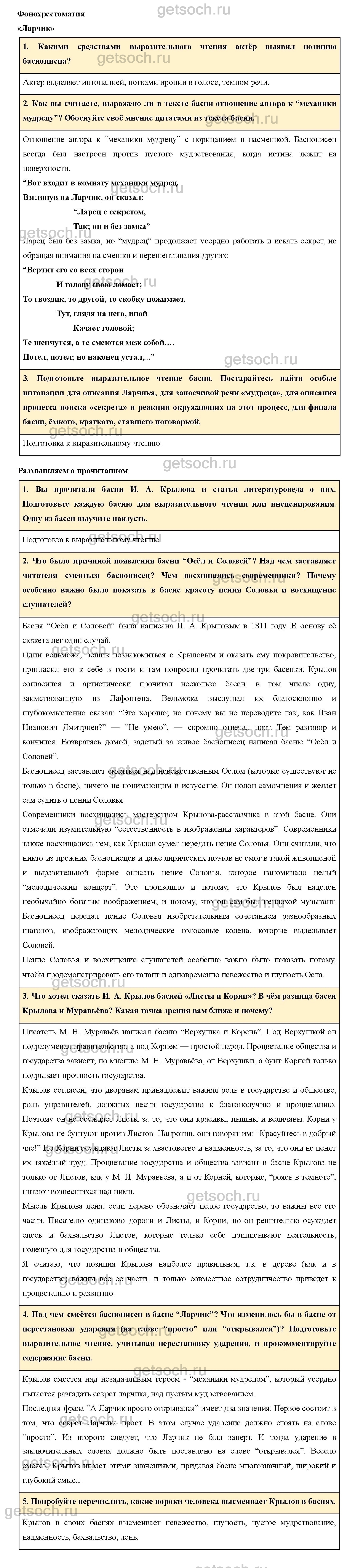 Подготовьте выразительное чтение басни. Постарайтесь найти особые интонации для описания Ларчика, для заносчивой речи «мудреца», для описания процесса поиска «секрета» и реакции окружающих на этот процесс, для финала басни, ёмкого, краткого, ставшего поговоркой.