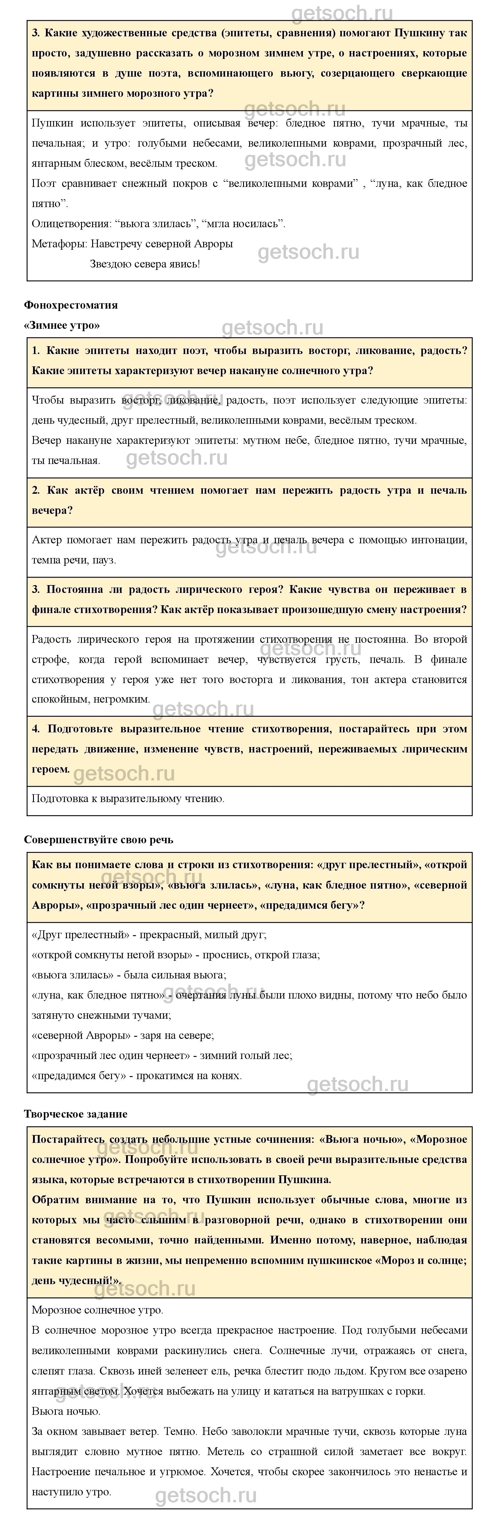 “Постарайтесь создать небольшие устные сочинения: «Вьюга ночью», «Морозное солнечное утро». Попробуйте использовать в своей речи выразительные средства языка, которые встречаются в стихотворении Пушкина.