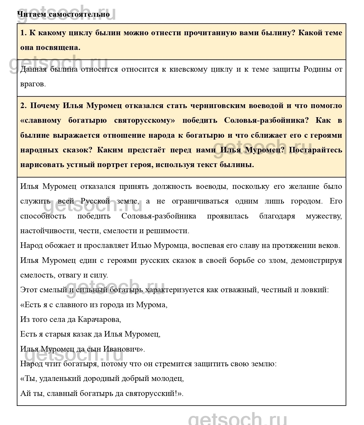 Почему Илья Муромец отказался стать черниговским воеводой и что помогло «славному богатырю святорусскому» победить Соловья-разбойника? Как в былине выражается отношение народа к богатырю и что сближает его с героями народных сказок? Каким предстаёт перед нами Илья Муромец? Постарайтесь нарисовать устный портрет героя, используя текст былины.