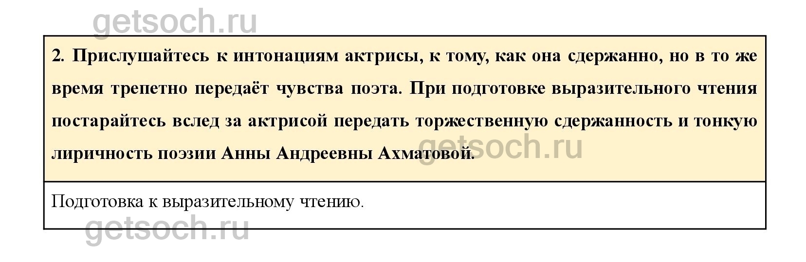 Прислушайтесь к интонациям актрисы, к тому, как она сдержанно, но в то же время трепетно передаёт чувства поэта. При подготовке выразительного чтения постарайтесь вслед за актрисой передать торжественную сдержанность и тонкую лиричность поэзии Анны Андреевны Ахматовой.