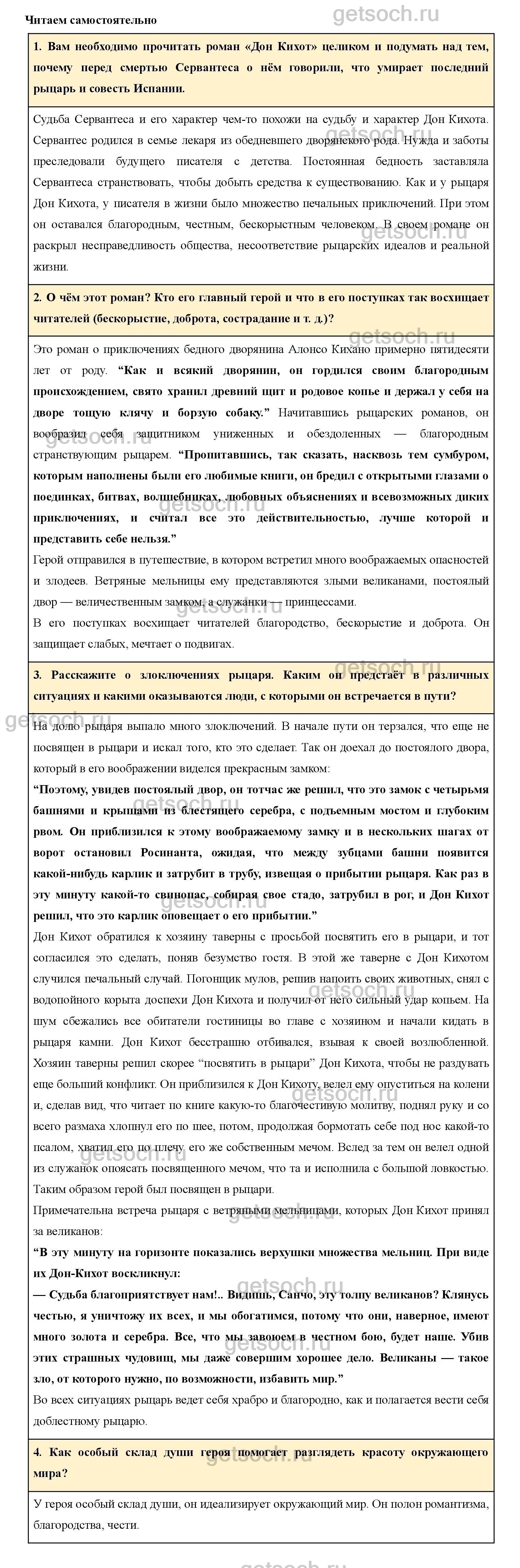 Вам необходимо прочитать роман «Дон Кихот» целиком и подумать над тем, почему перед смертью Сервантеса о нём говорили, что умирает последний рыцарь и совесть Испании.