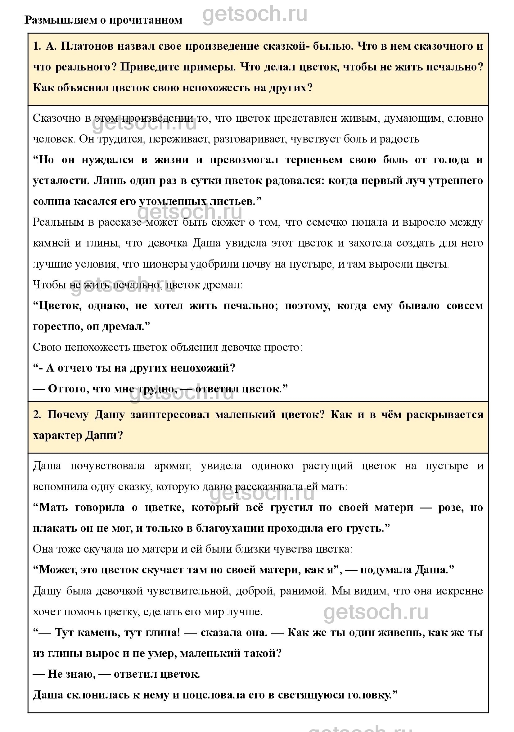 А. Платонов назвал свое произведение сказкой- былью. Что в нем сказочного и что реального? Приведите примеры. Что делал цветок, чтобы не жить печально? Как объяснил цветок свою непохожесть на других?