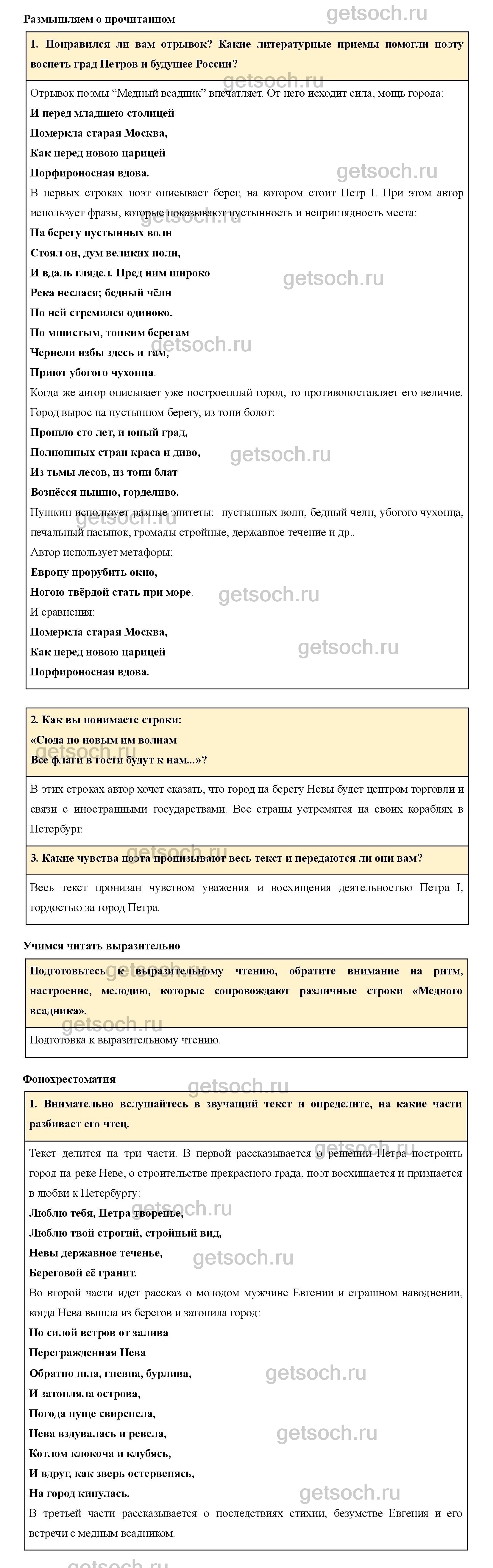1. Понравился ли вам отрывок? Какие литературные приемы помогли поэту воспеть град Петров и будущее России?