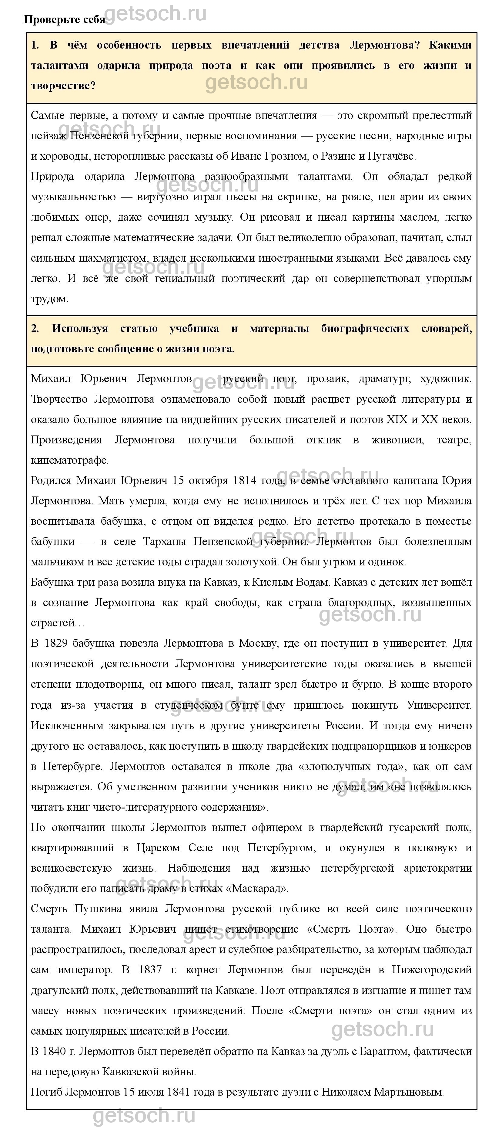 1. В чём особенность первых впечатлений детства Лермонтова? Какими талантами одарила природа поэта и как они проявились в его жизни и творчестве?