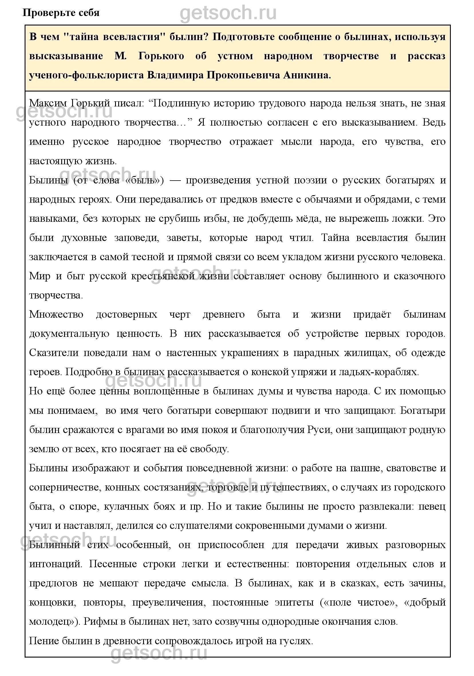 В чем “тайна всевластия” былин? Подготовьте сообщение о былинах, используя высказывание М. Горького об устном народном творчестве и рассказ ученого-фольклориста Владимира Прокопьевича Аникина.