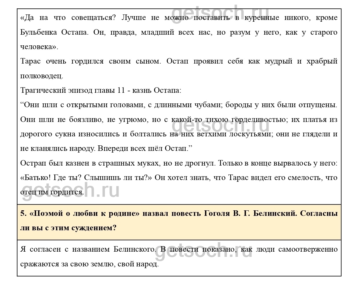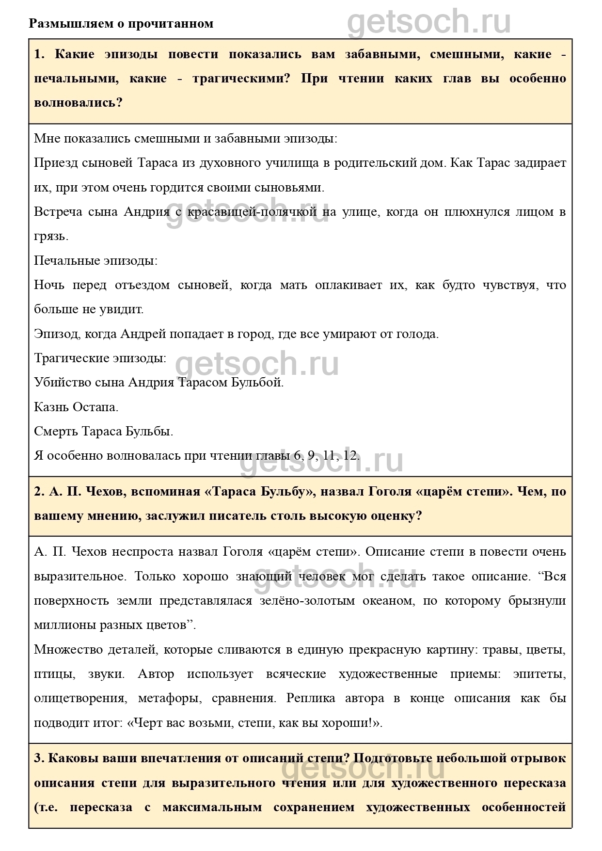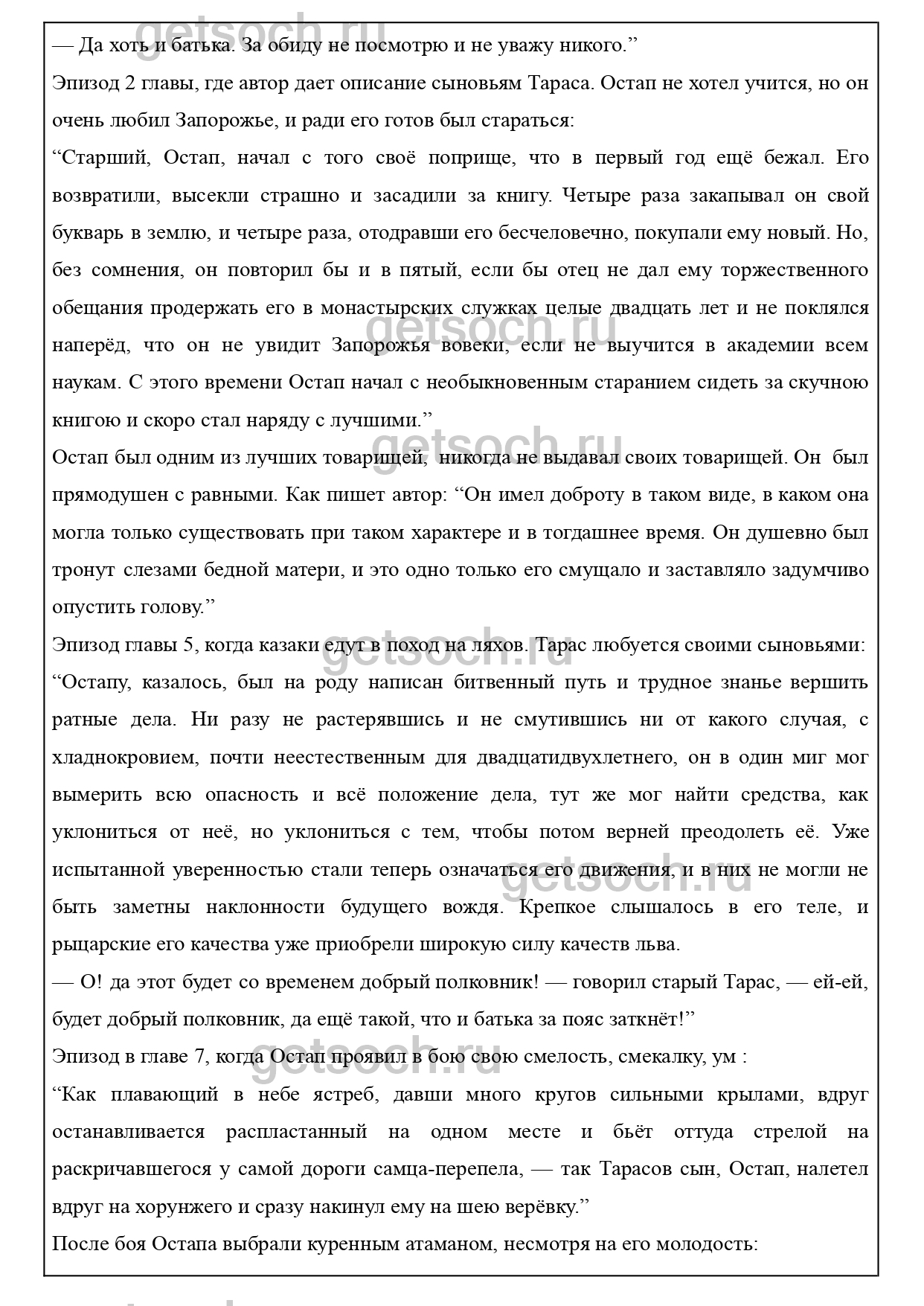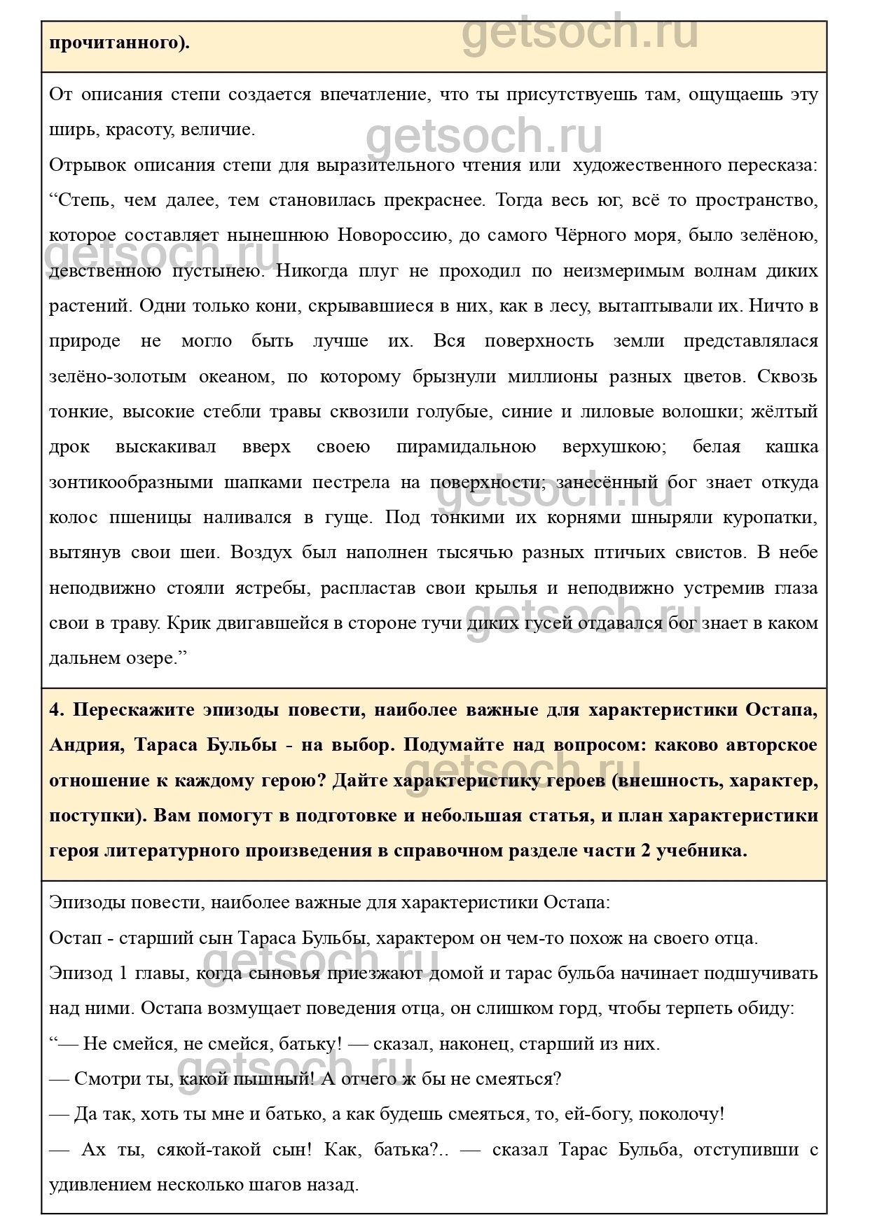 Перескажите эпизоды повести, наиболее важные для характеристики Остапа, Андрия, Тараса Бульбы – на выбор. Подумайте над вопросом: каково авторское отношение к каждому герою? Дайте характеристику героев (внешность, характер, поступки). Вам помогут в подготовке и небольшая статья, и план характеристики героя литературного произведения в справочном разделе части 2 учебника.