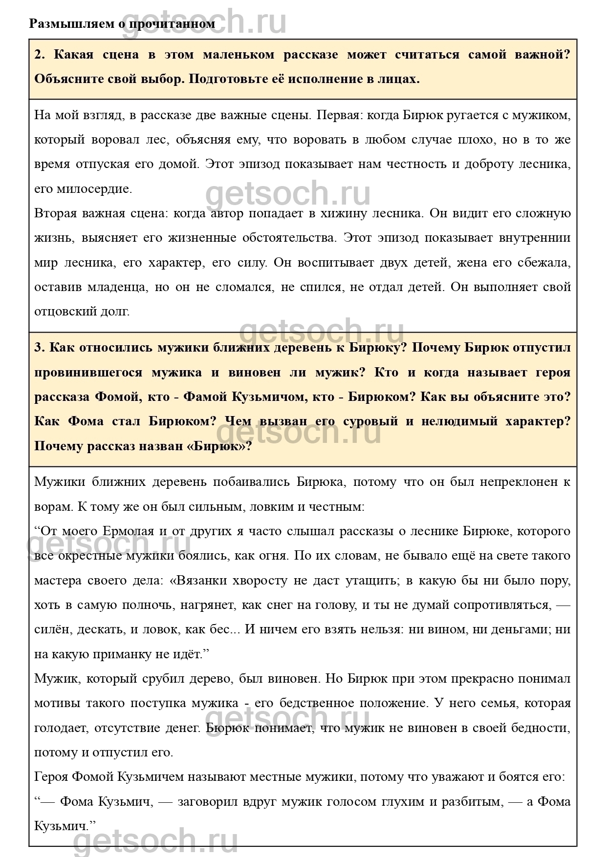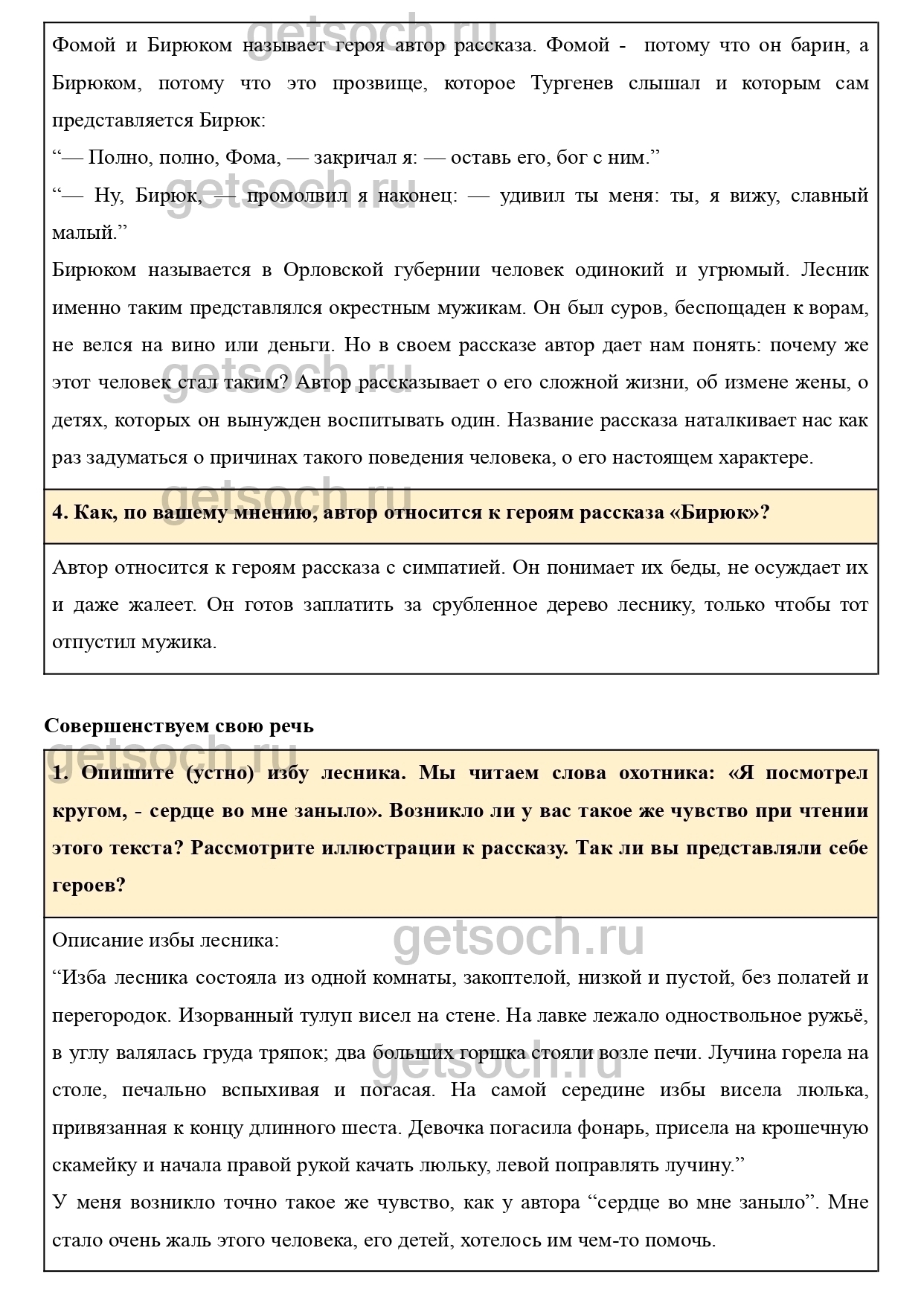 Как относились мужики ближних деревень к Бирюку? Почему Бирюк отпустил провинившегося мужика и виновен ли мужик? Кто и когда называет героя рассказа Фомой, кто – Фамой Кузьмичом, кто – Бирюком? Как вы объясните это? Как Фома стал Бирюком? Чем вызван его суровый и нелюдимый характер? Почему рассказ назван «Бирюк»?