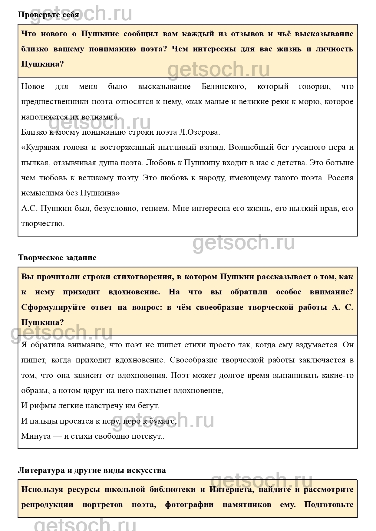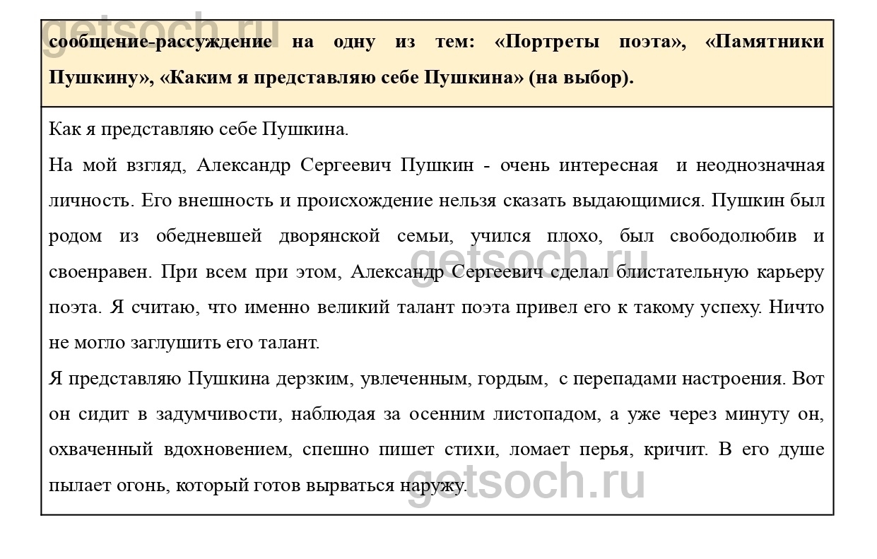 Используя ресурсы школьной библиотеки и Интернета, найдите и рассмотрите репродукции портретов поэта, фотографии памятников ему. Подготовьте сообщение-рассуждение на одну из тем: «Портреты поэта», «Памятники Пушкину», «Каким я представляю себе Пушкина» (на выбор).