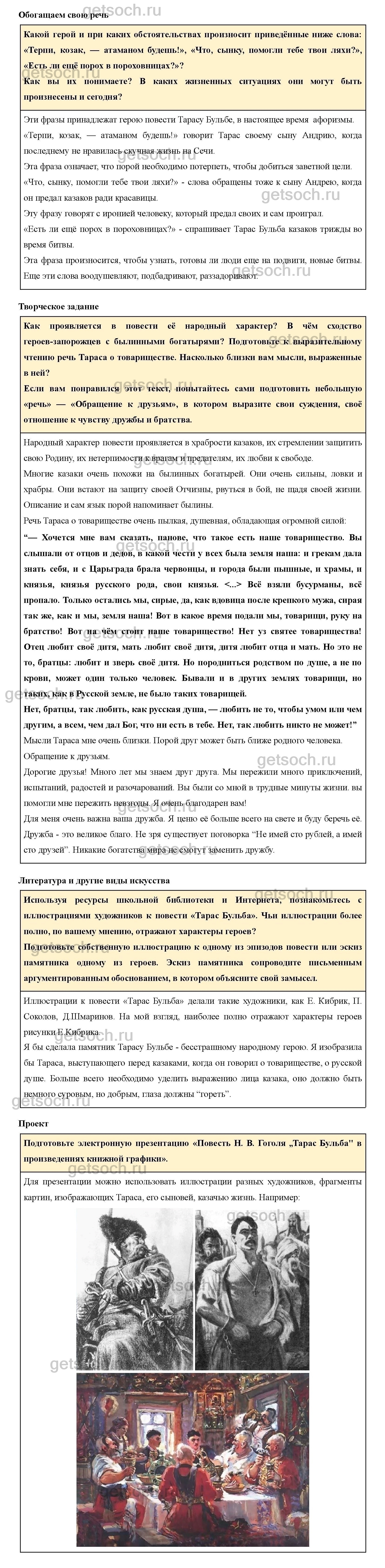 “Как проявляется в повести её народный характер? В чём сходство героев-запорожцев с былинными богатырями? Подготовьте к выразительному чтению речь Тараса о товариществе. Насколько близки вам мысли, выраженные в ней?