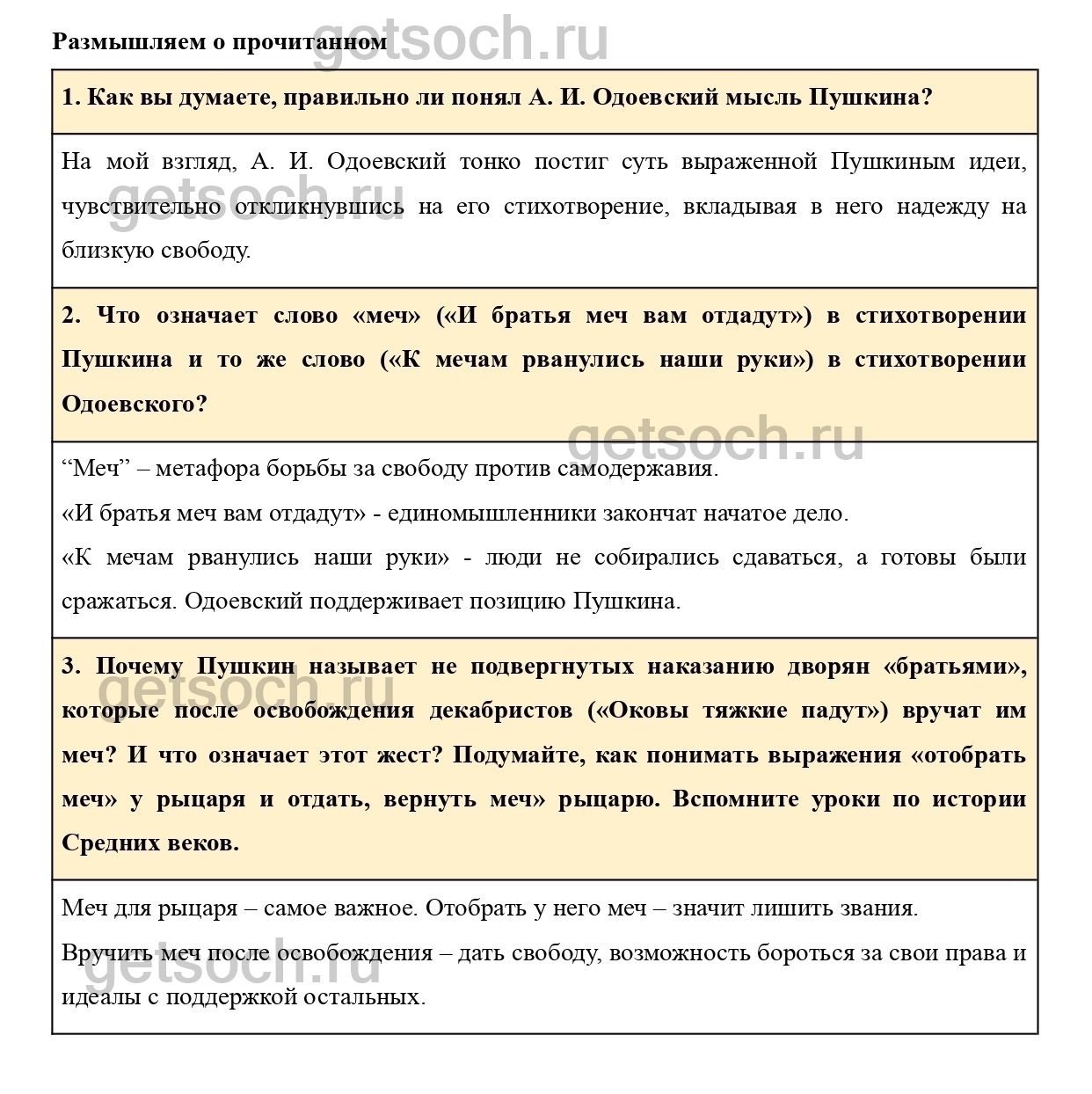 Почему Пушкин называет не подвергнутых наказанию дворян «братьями», которые после освобождения декабристов («Оковы тяжкие падут») вручат им меч? И что означает этот жест? Подумайте, как понимать выражения «отобрать меч» у рыцаря и отдать, вернуть меч» рыцарю. Вспомните уроки по истории Средних веков.