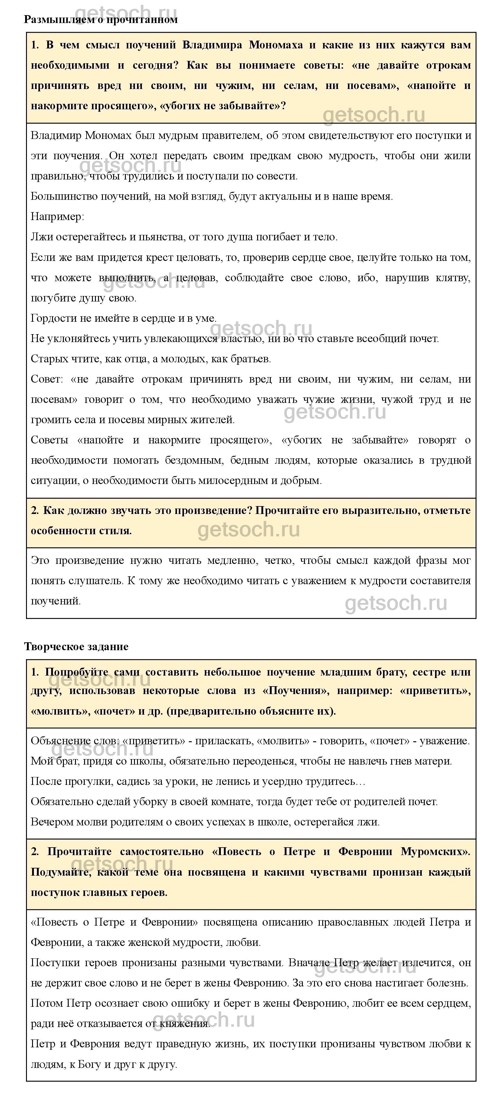1. Попробуйте сами составить небольшое поучение младшим брату, сестре или другу, использовав некоторые слова из «Поучения», например: «приветить», «молвить», «почет» и др. (предварительно объясните их).