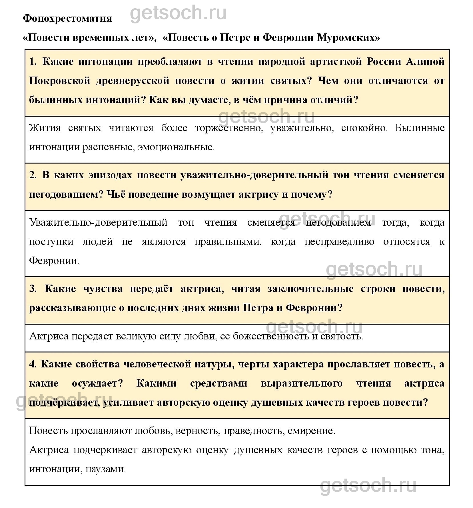 1. Какие интонации преобладают в чтении народной артисткой России Алиной Покровской древнерусской повести о житии святых? Чем они отличаются от былинных интонаций? Как вы думаете, в чём причина отличий?