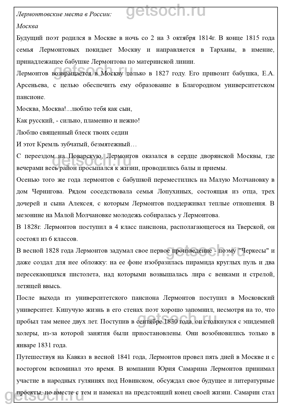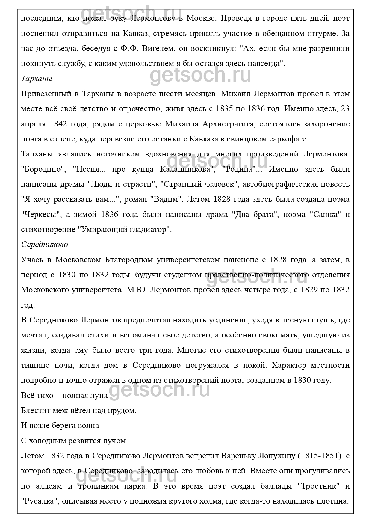 Подготовьте электронную презентацию «Лермонтовские места России (Москва, Тарханы, Середниково, Петербург, Пятигорск)». Расскажите об этапах жизни поэта, связанных с этими местами, о произведениях, там написанных.