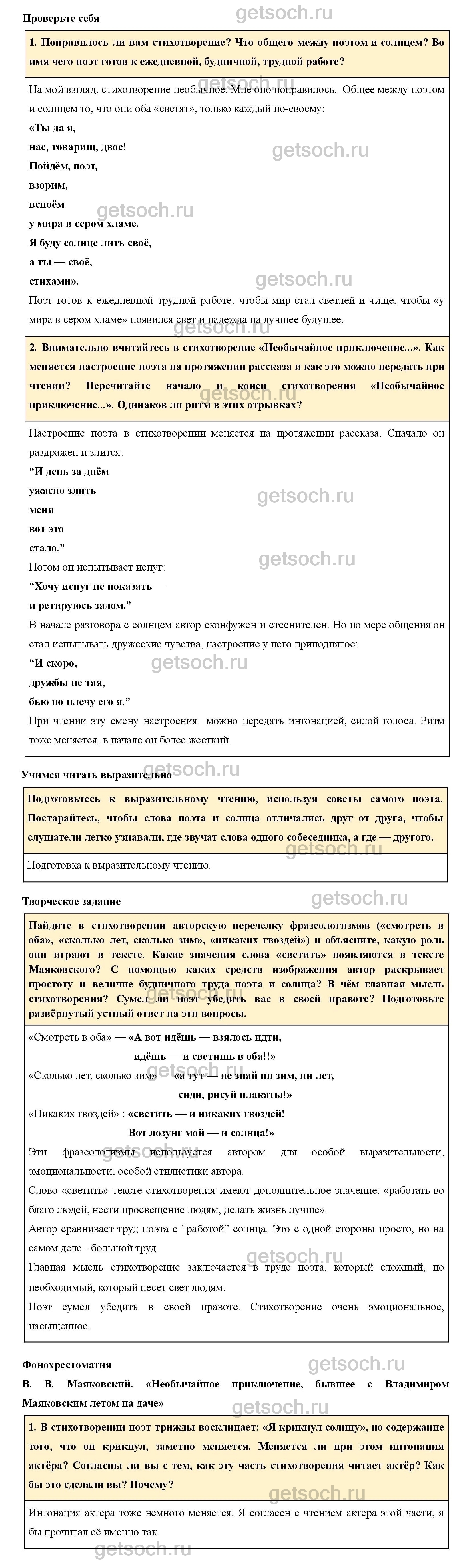 Найдите в стихотворении авторскую переделку фразеологизмов («смотреть в оба», «сколько лет, сколько зим», «никаких гвоздей») и объясните, какую роль они играют в тексте. Какие значения слова «светить» появляются в тексте Маяковского? С помощью каких средств изображения автор раскрывает простоту и величие будничного труда поэта и солнца? В чём главная мысль стихотворения? Сумел ли поэт убедить вас в своей правоте? Подготовьте развёрнутый устный ответ на эти вопросы.