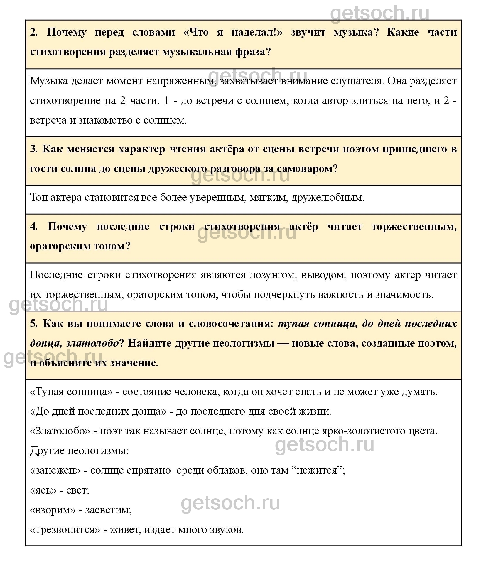 3. Как меняется характер чтения актёра от сцены встречи поэтом пришедшего в гости солнца до сцены дружеского разговора за самоваром?