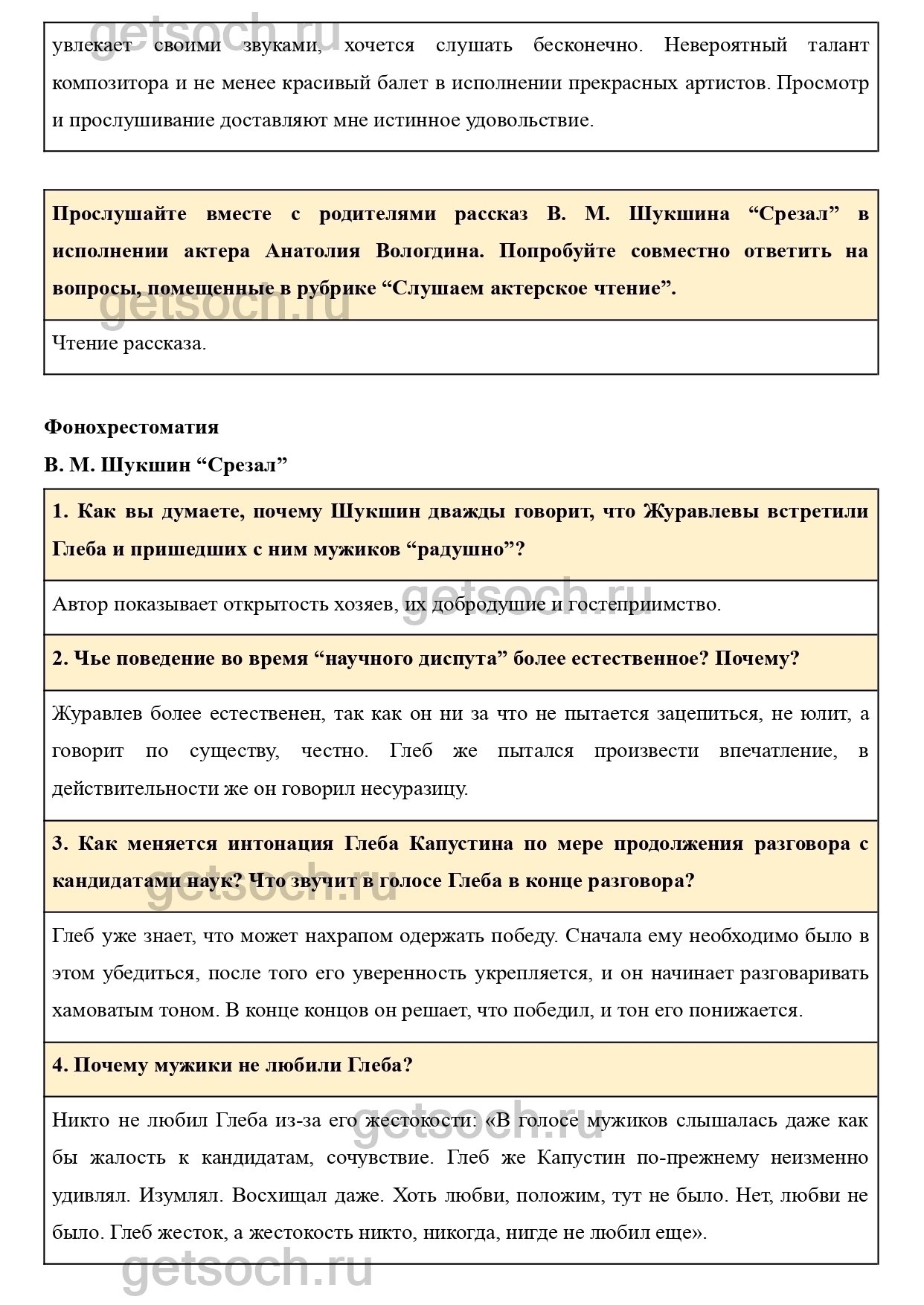 Прослушайте вместе с родителями рассказ В. М. Шукшина “Срезал” в исполнении актера Анатолия Вологдина. Попробуйте совместно ответить на вопросы, помещенные в рубрике “Слушаем актерское чтение”.