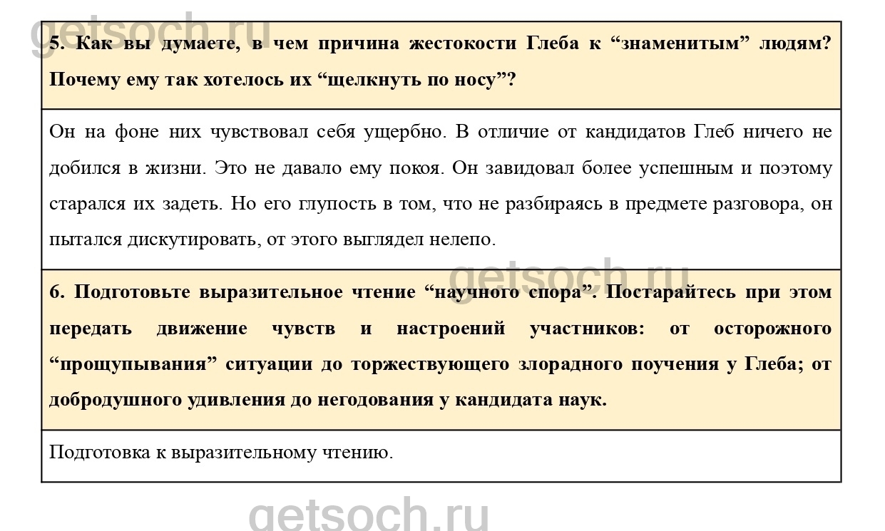 6. Подготовьте выразительное чтение “научного спора”. Постарайтесь при этом передать движение чувств и настроений участников: от осторожного “прощупывания” ситуации до торжествующего злорадного поучения у Глеба; от добродушного удивления до негодования у кандидата наук.
